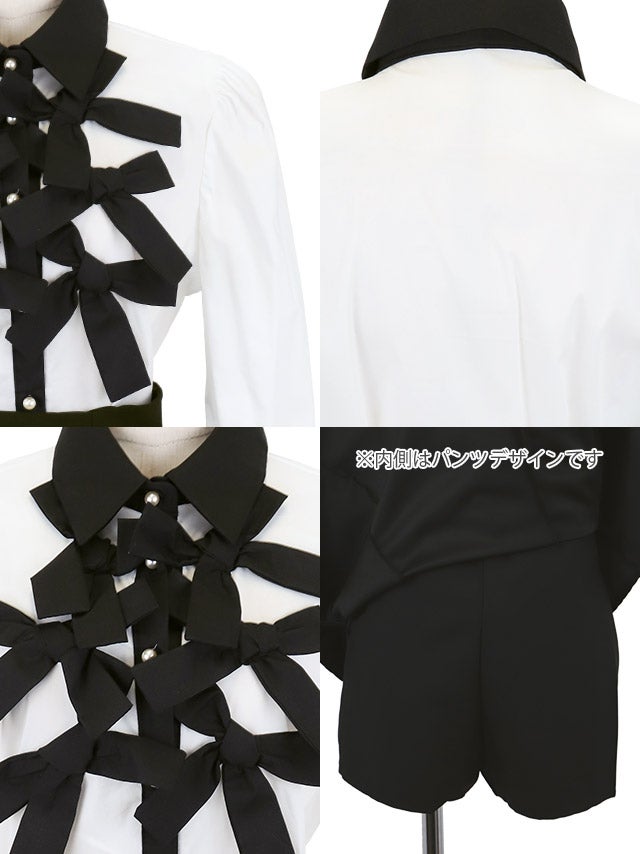 [韓国ドレス] 襟デザイン リボン 半袖 パフスリーブ ウエストカット モノトーン ミニドレス