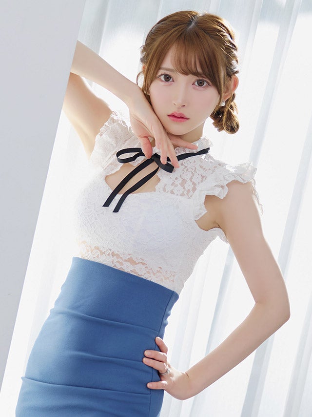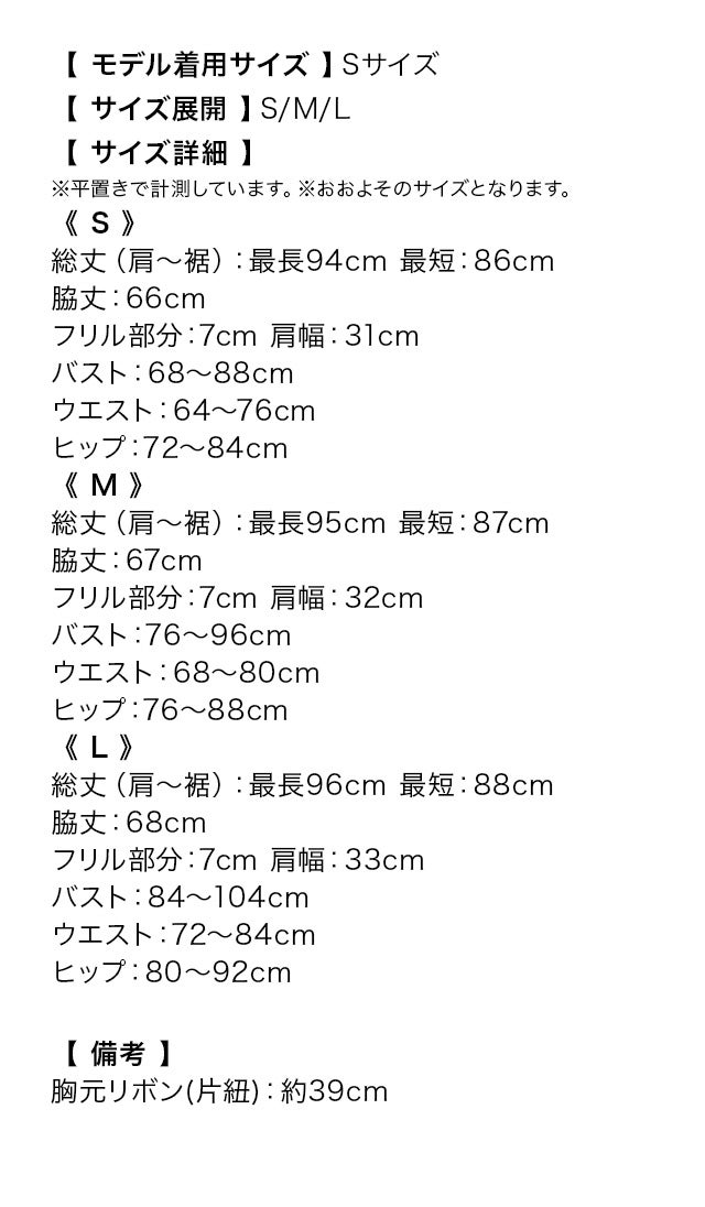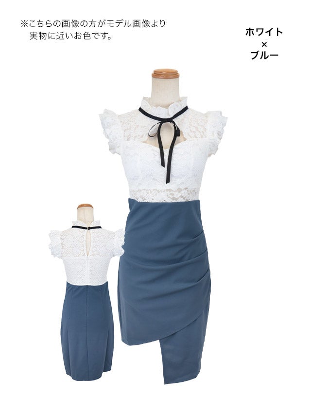[韓国ドレス] ネックリボンレースデザインフリルノースリーブウエスト切替アシメスカートタイトミニドレス