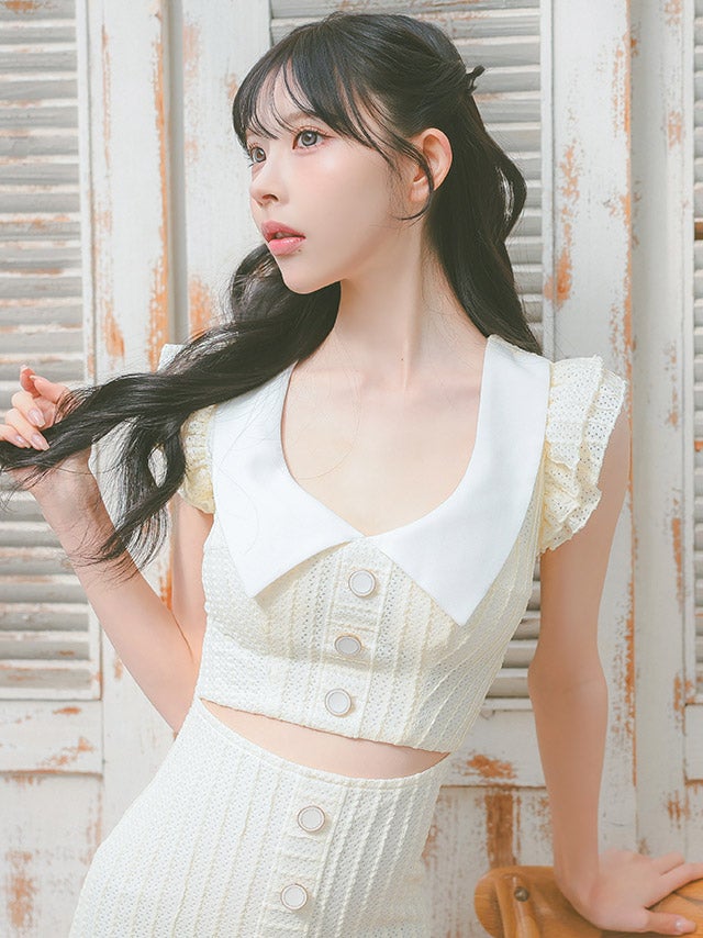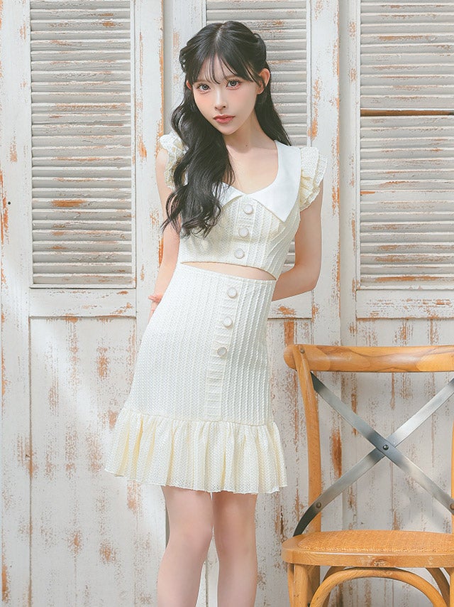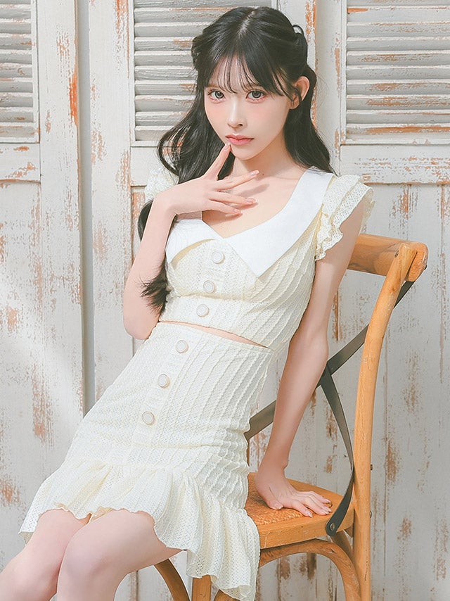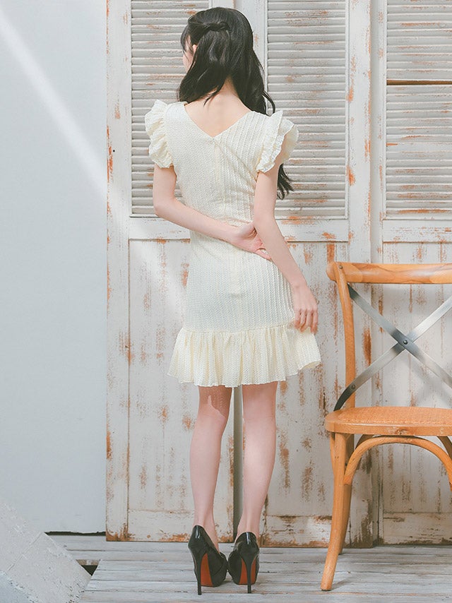 [韓国ドレス] セーラーフリル袖コットンレースウエストカット裾フリルタイトミニドレス