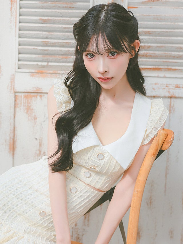 [韓国ドレス] 襟付きフリル袖ウエストカットコットンレース裾フリルガーリータイトミニドレス