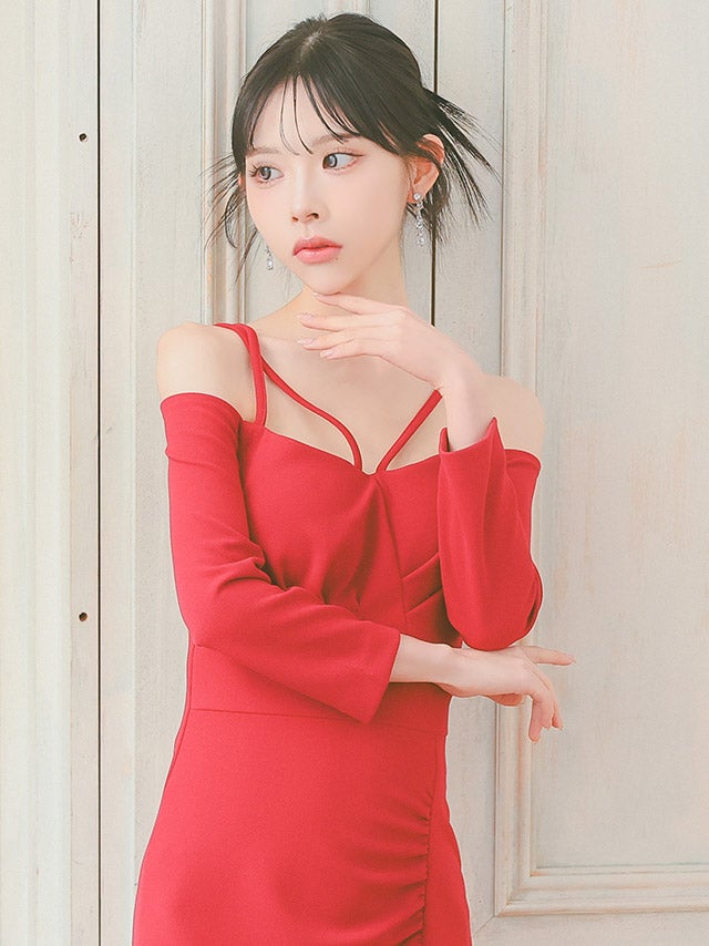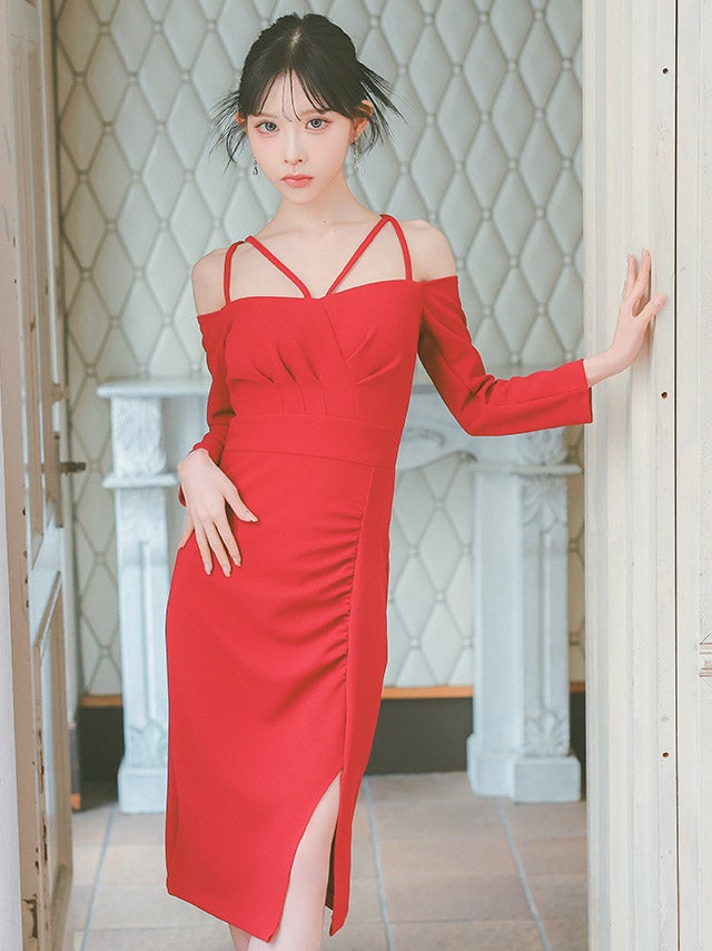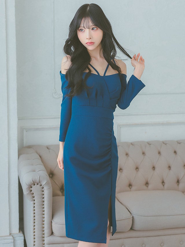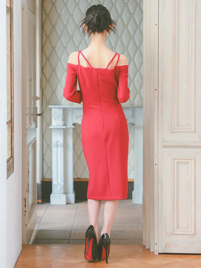 [韓国ドレス] キャミ風コードデザイン七分袖オフショルダースリット入りタイト膝丈ドレス