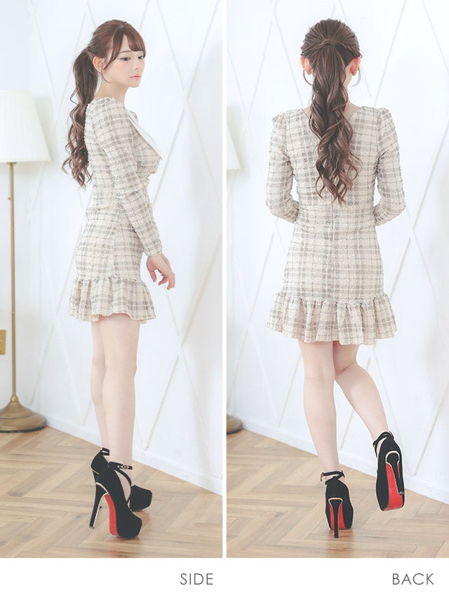 [韓国ドレス] ウエストカット 半袖 パフスリーブ ツイード 襟デザイン タイトミニドレス