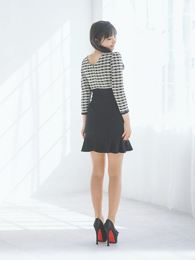 ツイードパールボタン長袖マーメイドミニドレス