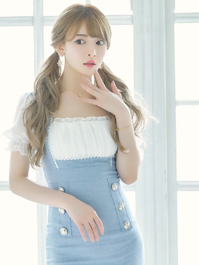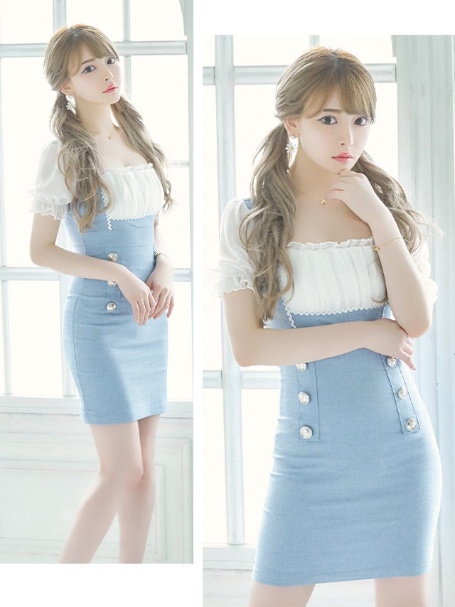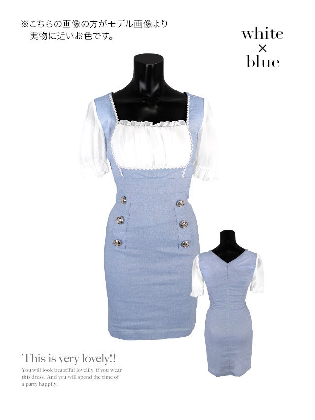 [韓国ドレス] シフォンサロペット風タイトミニ半袖パフスリーブドレス