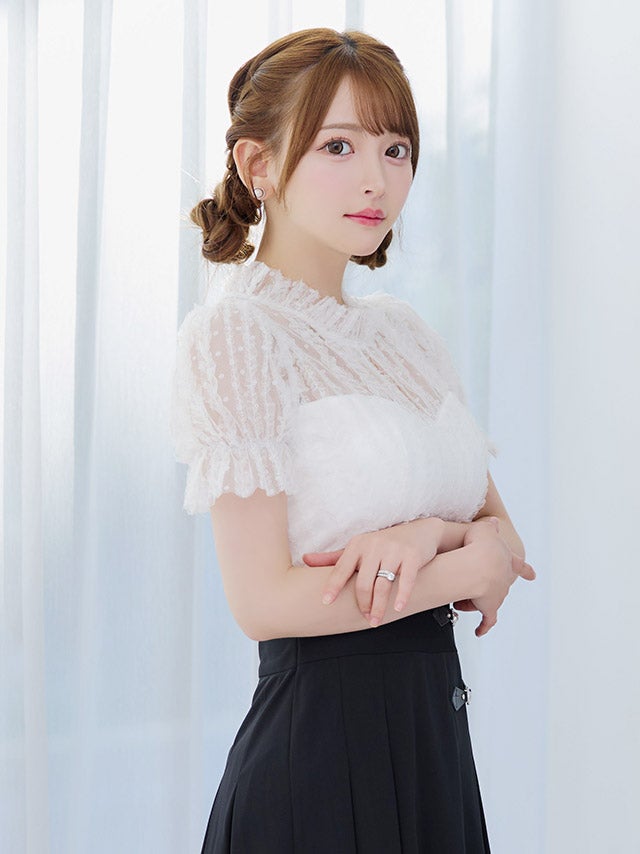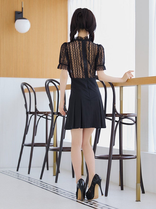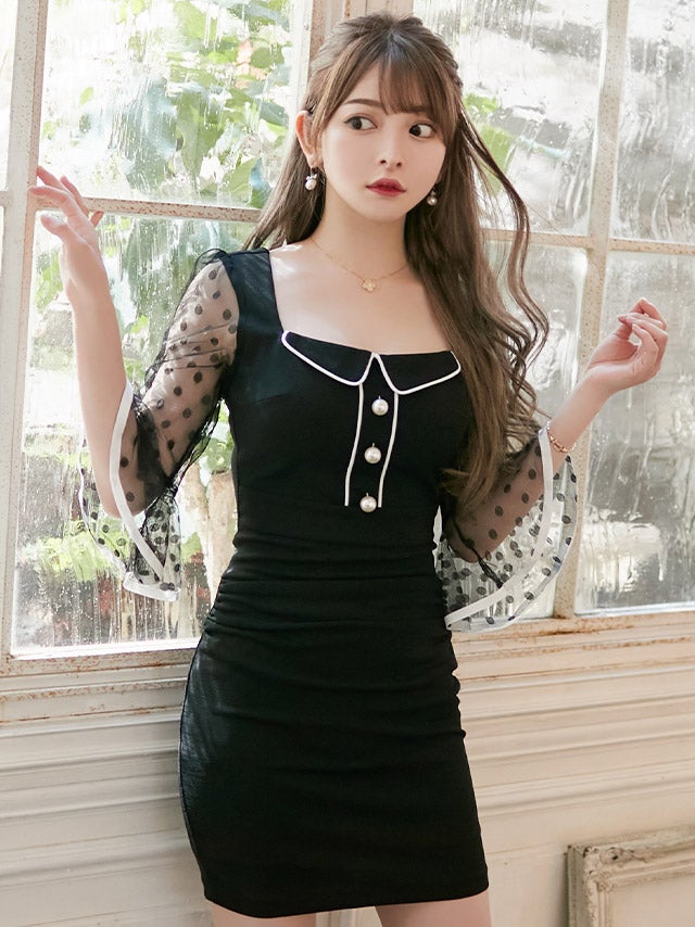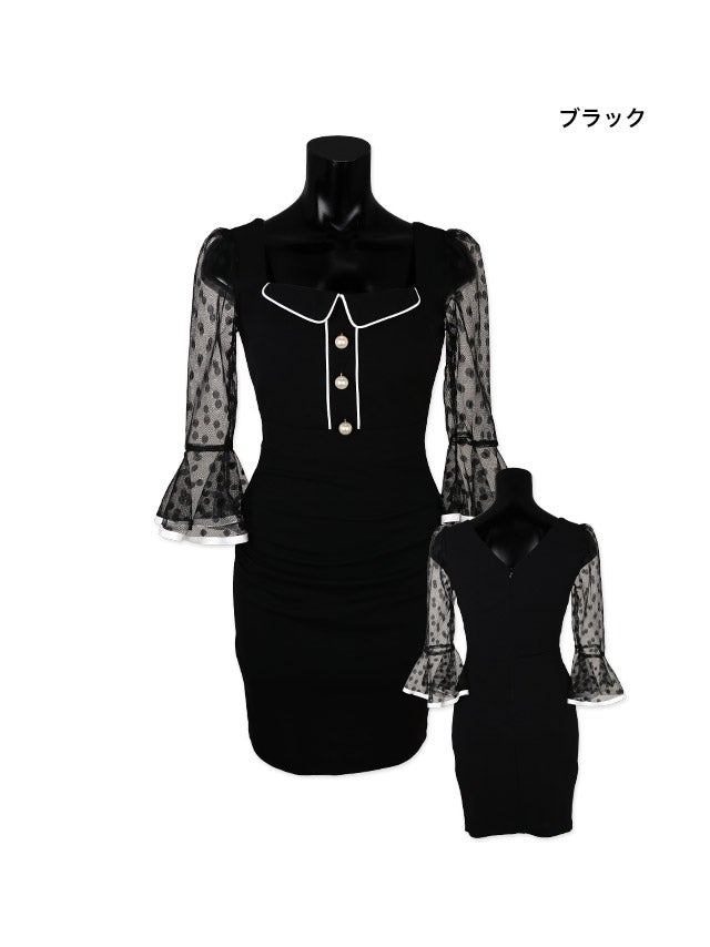 [韓国ドレス] ドット柄シースルーパフスリーブ袖ありタイトミニドレス