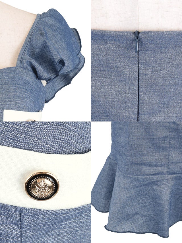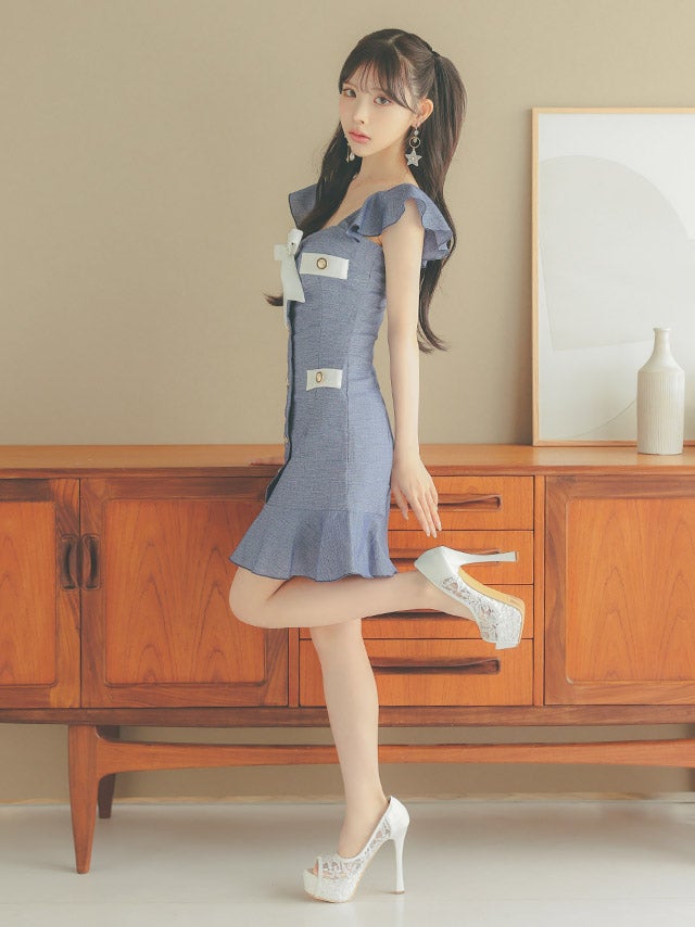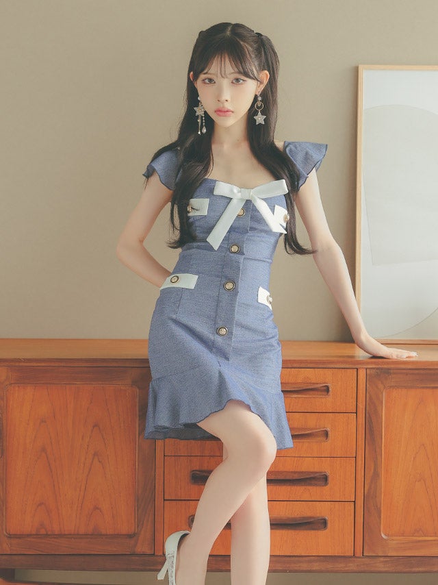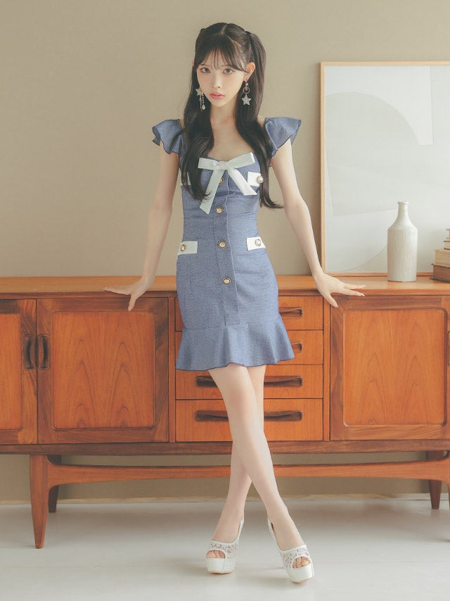 [韓国ドレス] ネックリボンデニム風フリルノースリーブマーメイドミニドレス