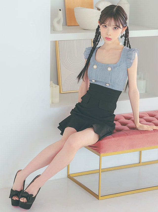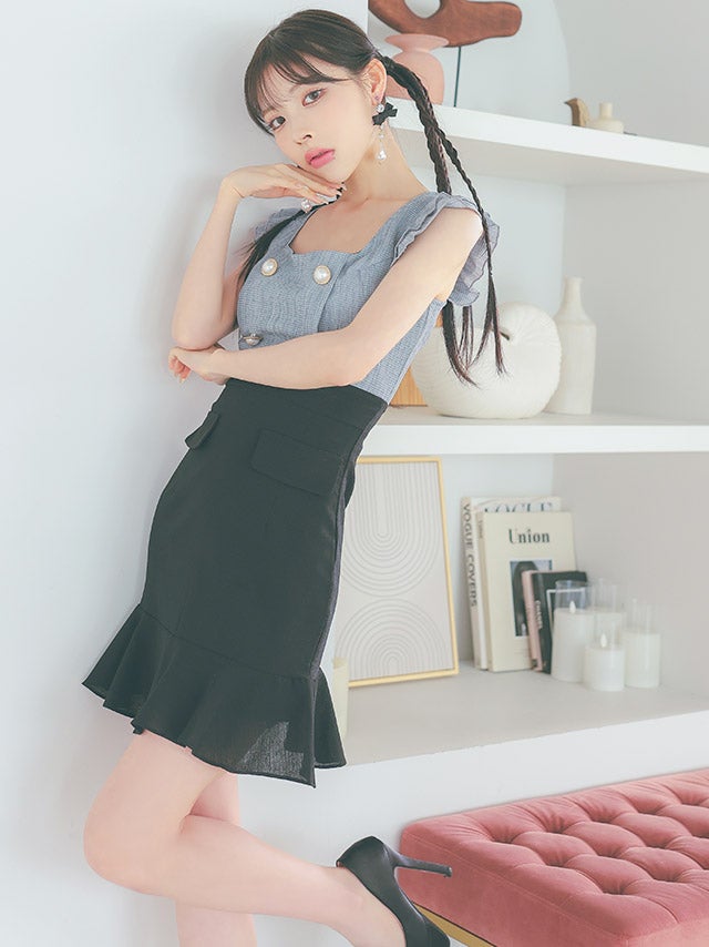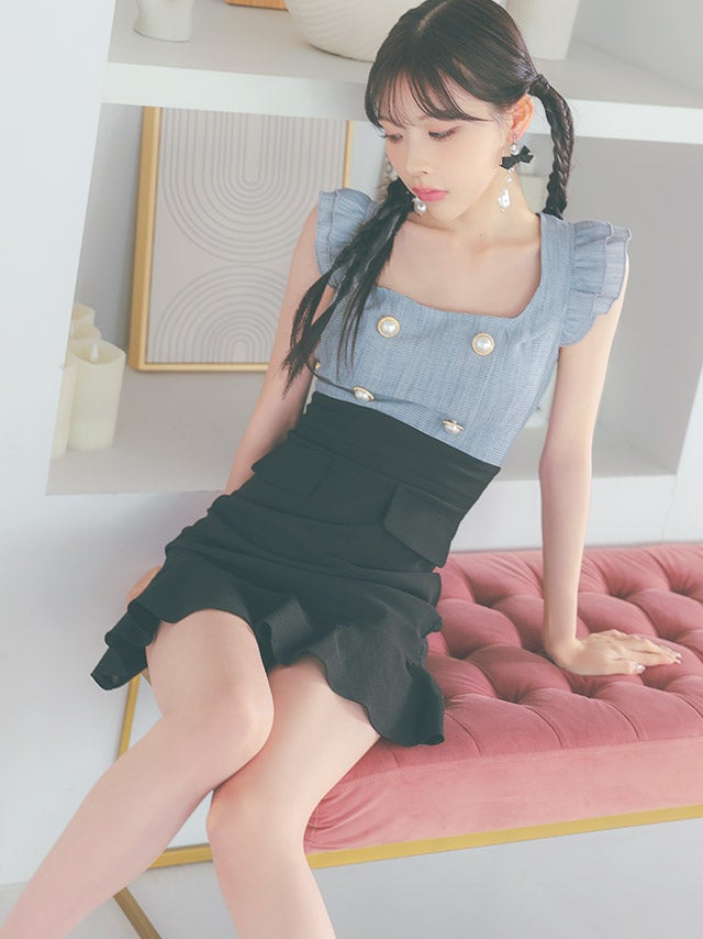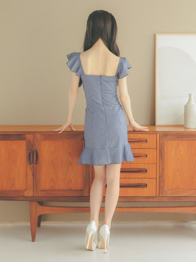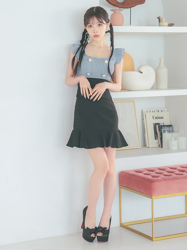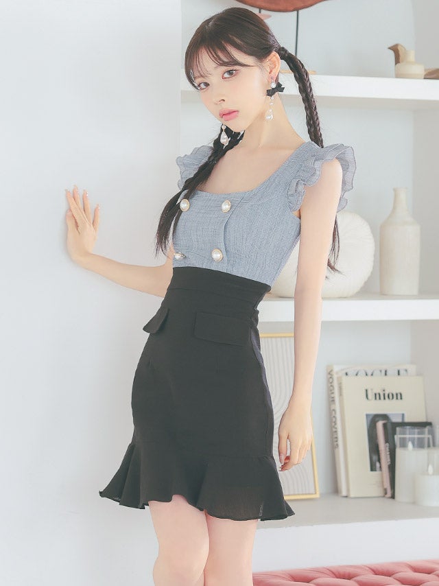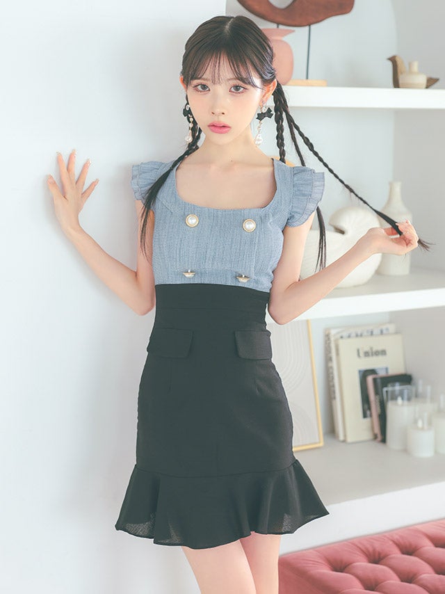 [韓国ドレス] フリル ノースリーブ スクエアネック ウエスト切替 マーメイドミニドレス