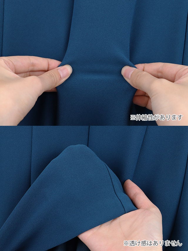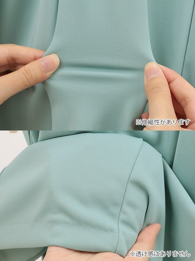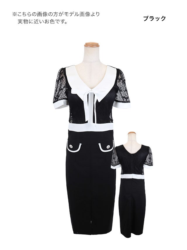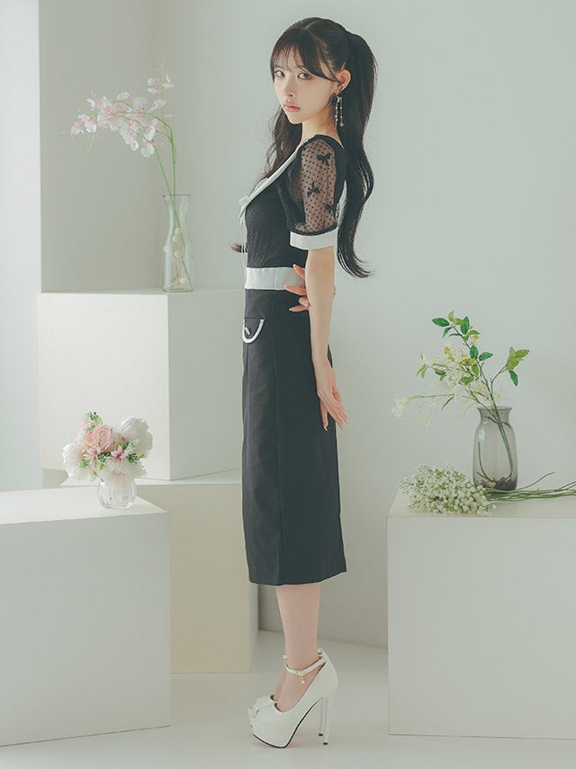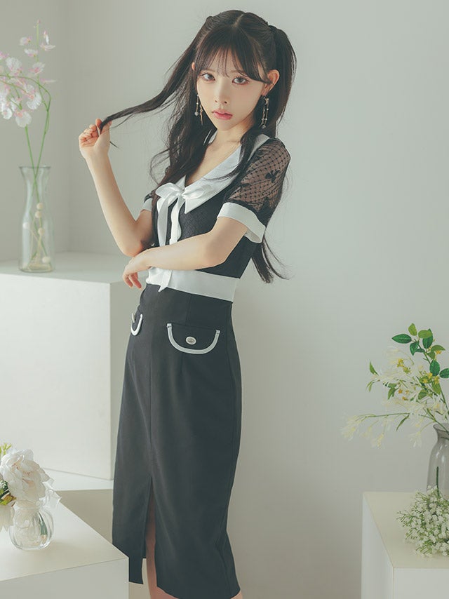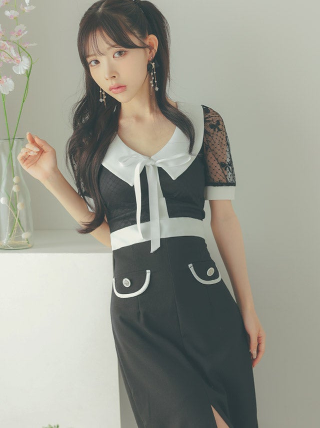 [韓国ドレス] 襟付きネックリボンシアースリーブフロントスリット膝丈タイトドレス