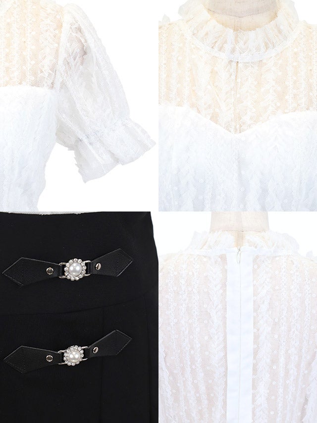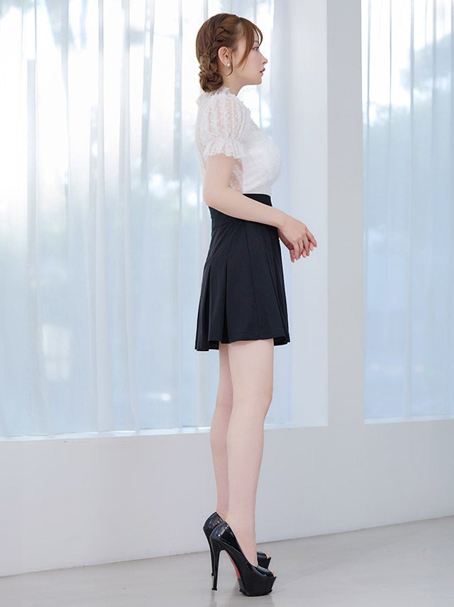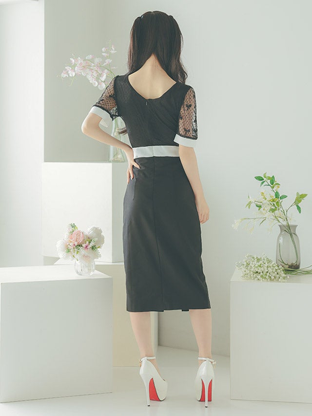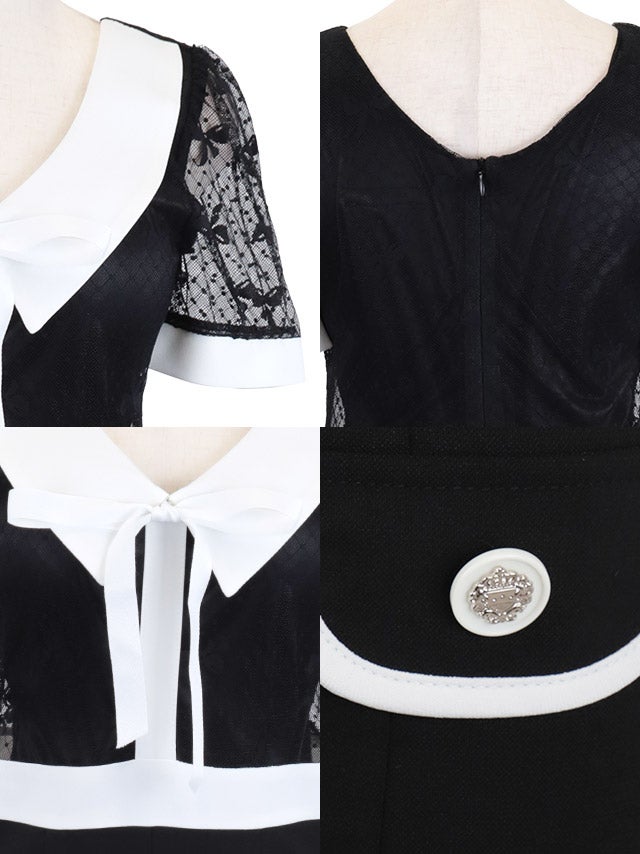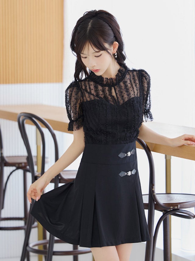 [韓国ドレス] モノトーンウエスト切替レースデザイン半袖フレアミニドレス