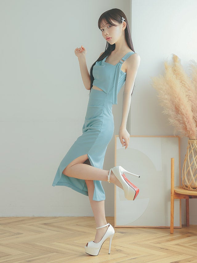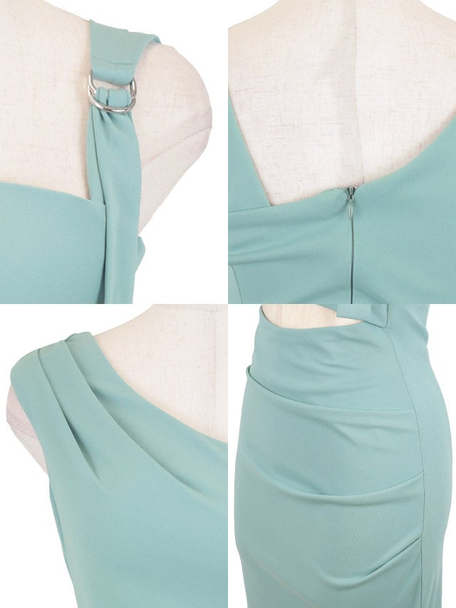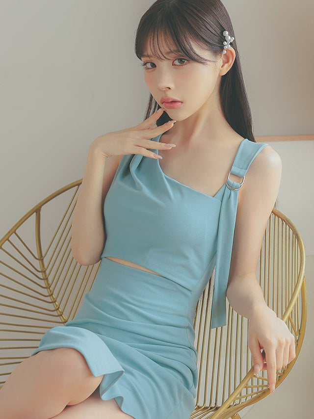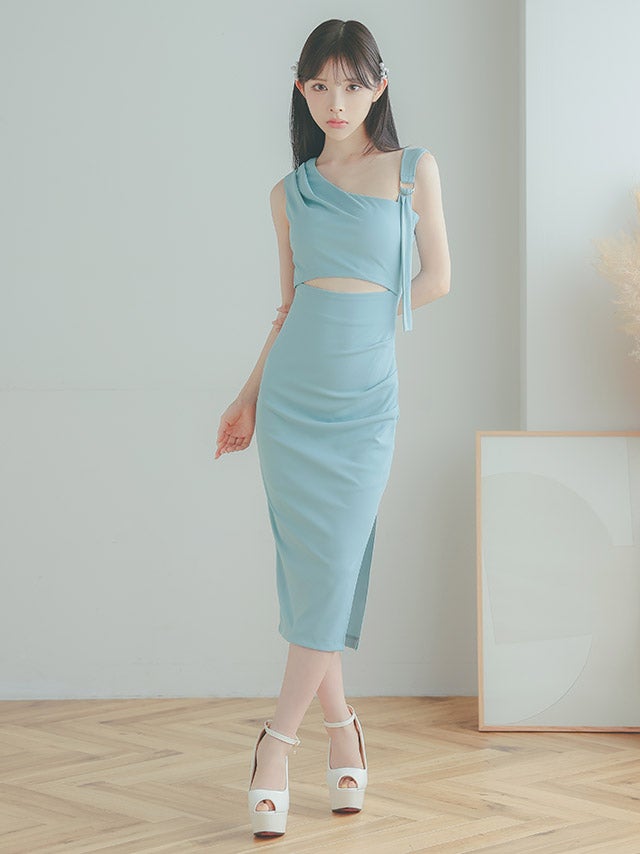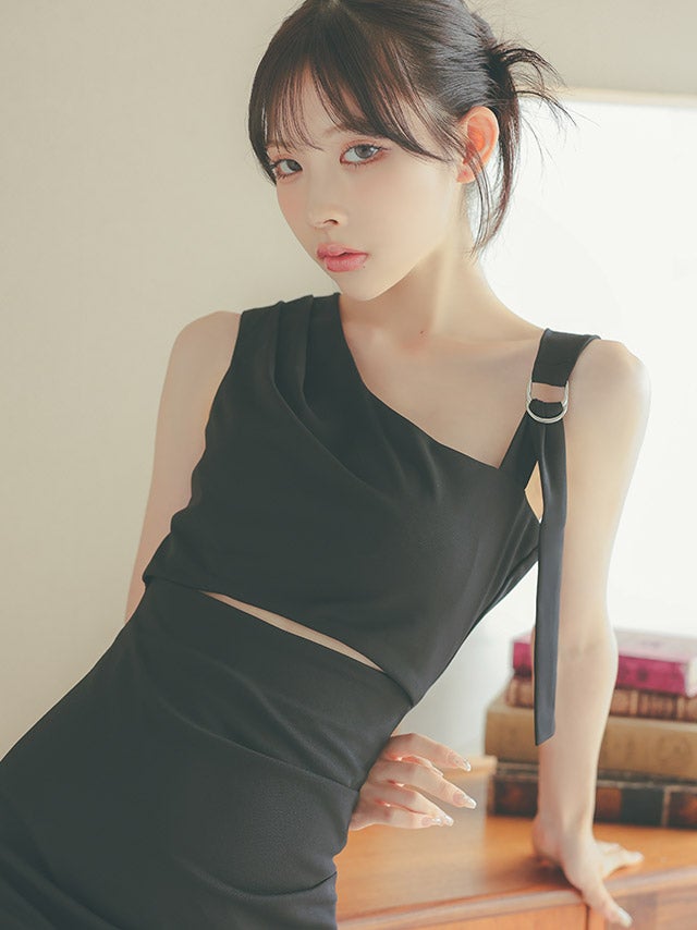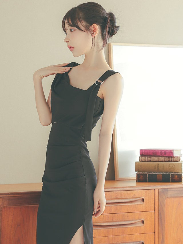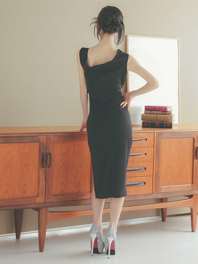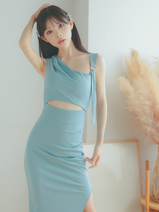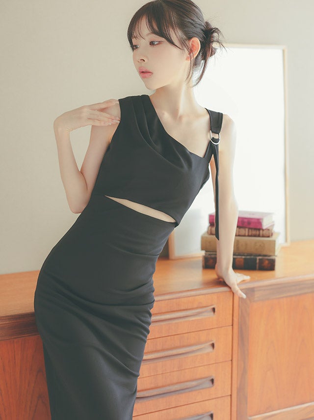 [韓国ドレス] ノースリーブウエストカットワンショル風膝丈スリット入りタイトドレス