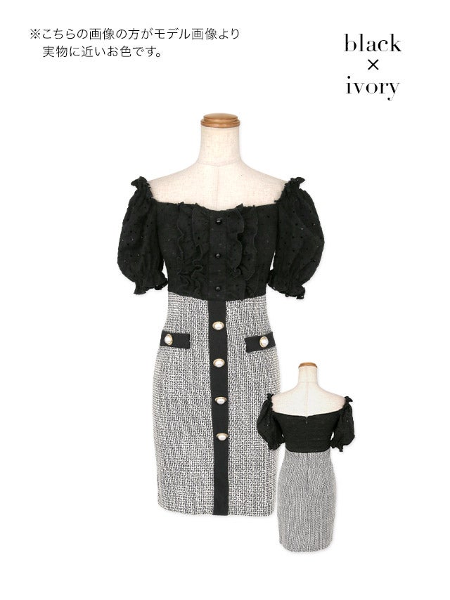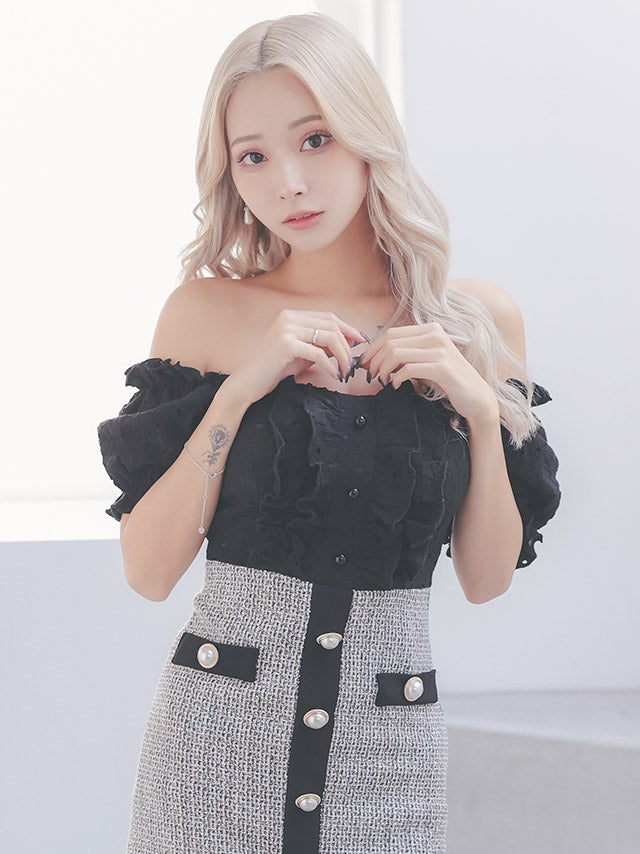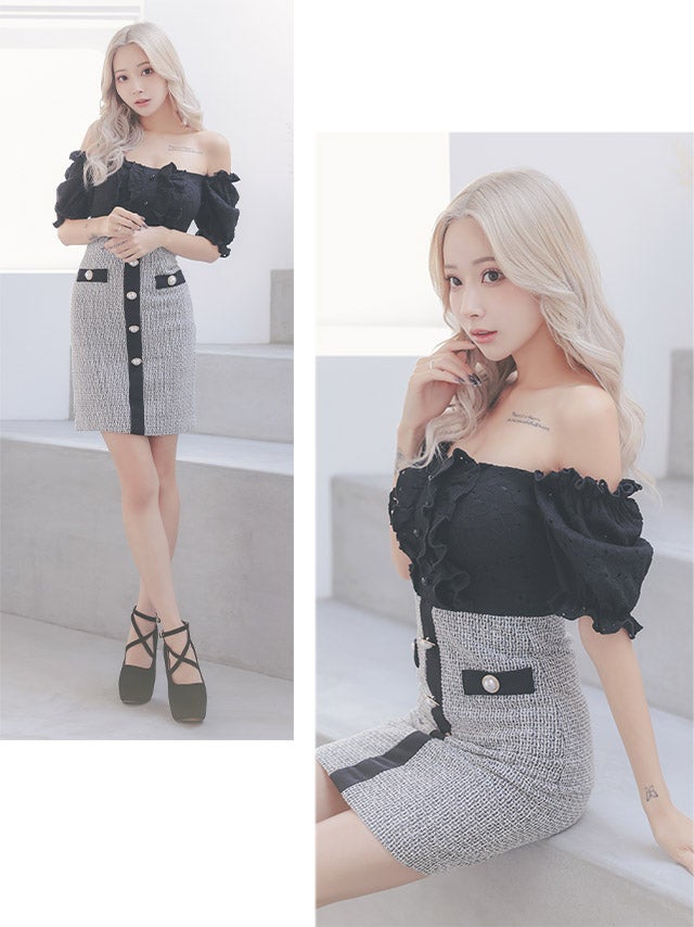 [韓国ドレス] オフショルダーフリルパフスリーブ切替モノトーンツイードタイトミニドレス