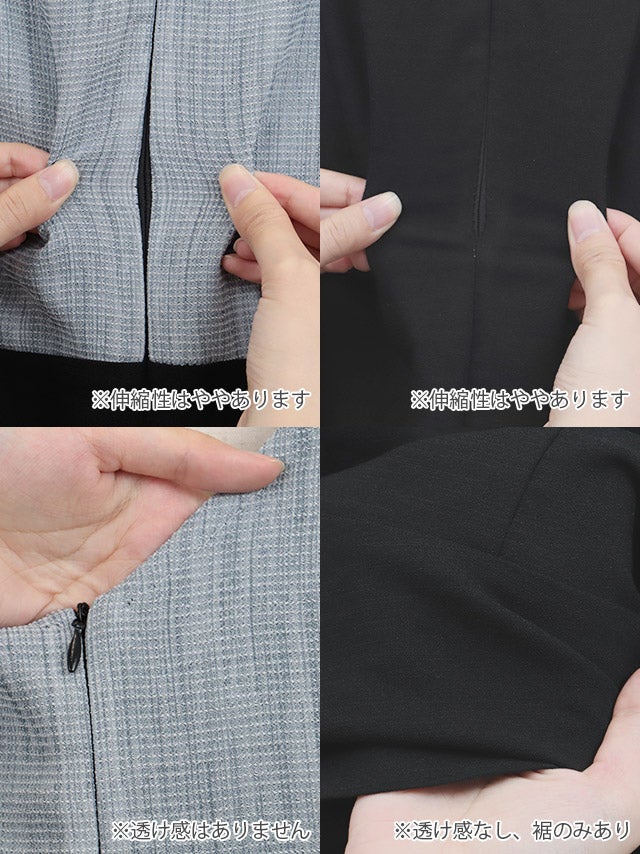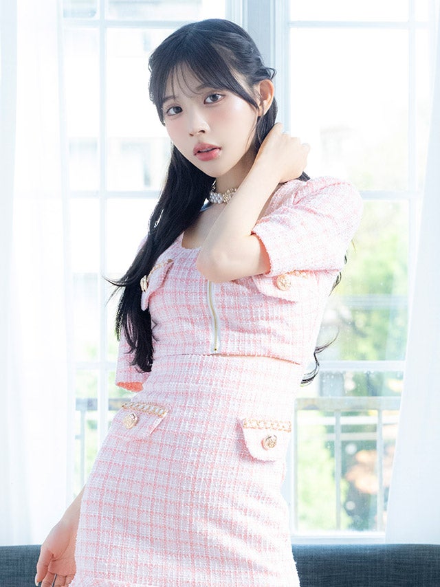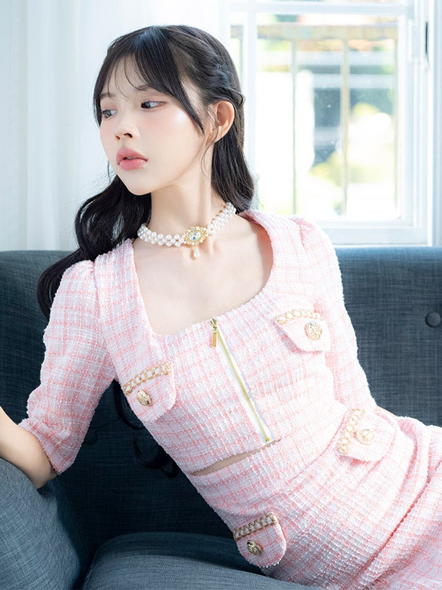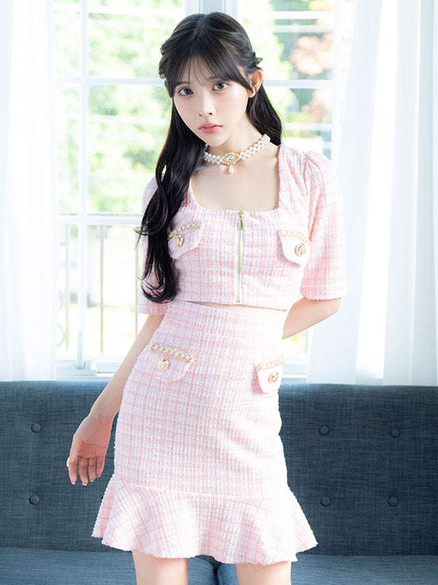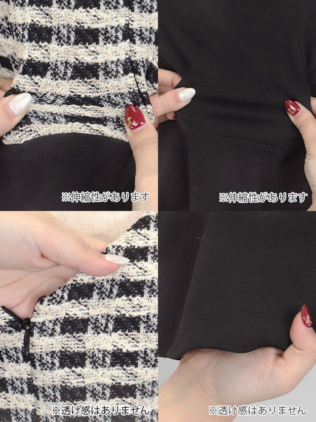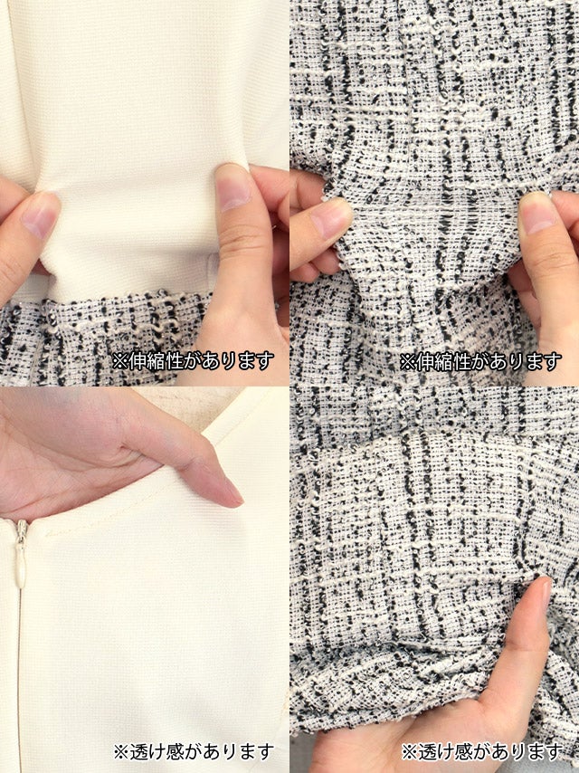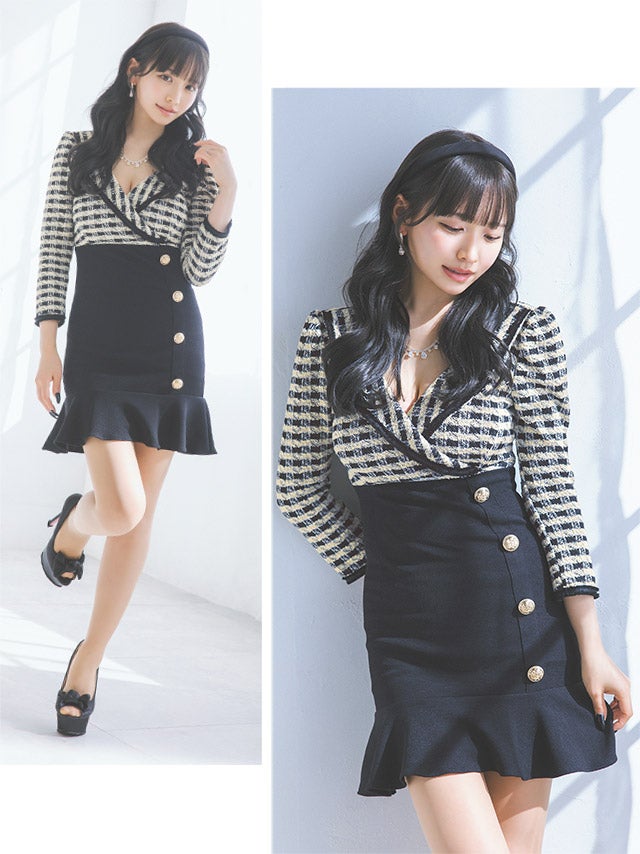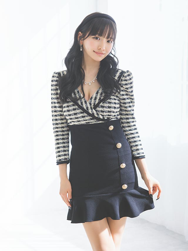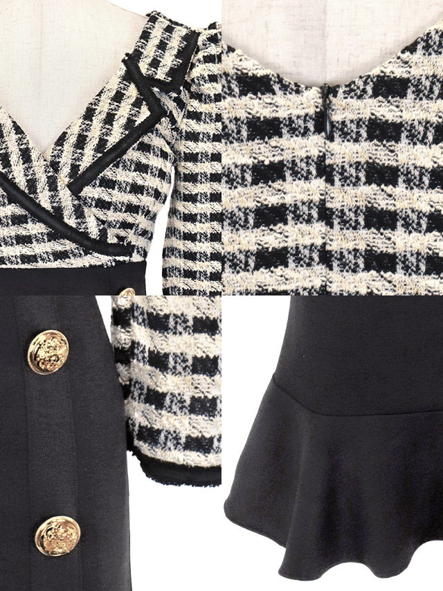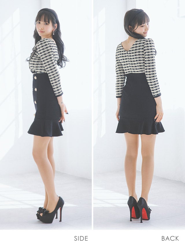 [韓国ドレス] フロントジップ半袖チェック柄ツイードウエストカットマーメイドミニドレス