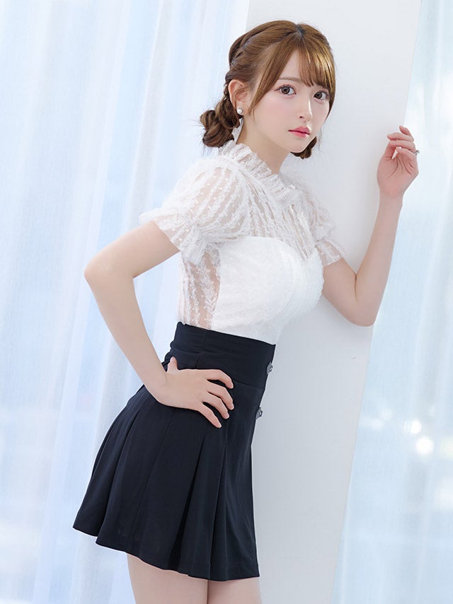 [韓国ドレス] レース 胸あき ネックリボン 長袖 パフスリーブ ハイウエスト切替 フレアミニドレス