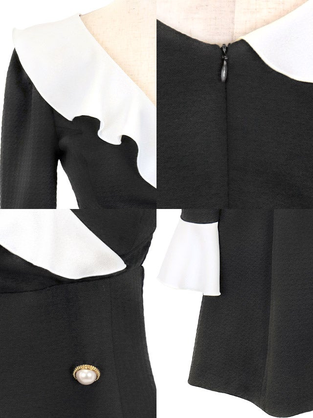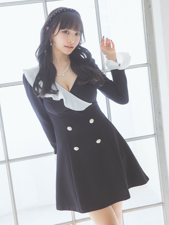 [韓国ドレス] 長袖カシュクールアシメフリルダブルボタンモノトーンフレアミニドレス