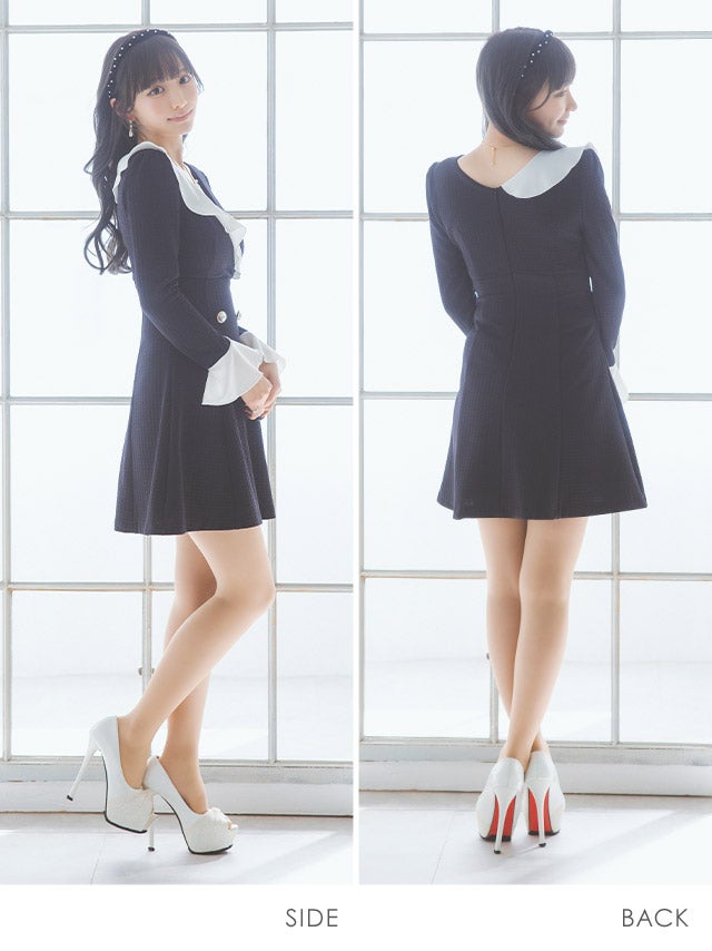 [韓国ドレス] 袖ありウエストカットフリルタイトミニドレス