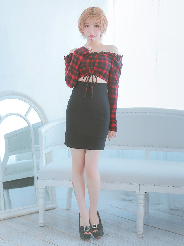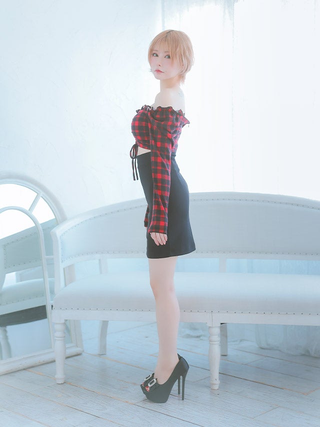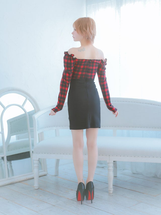 [韓国ドレス] オフショルダー長袖バッファローチェックウエストカット切り替えタイトミニドレス