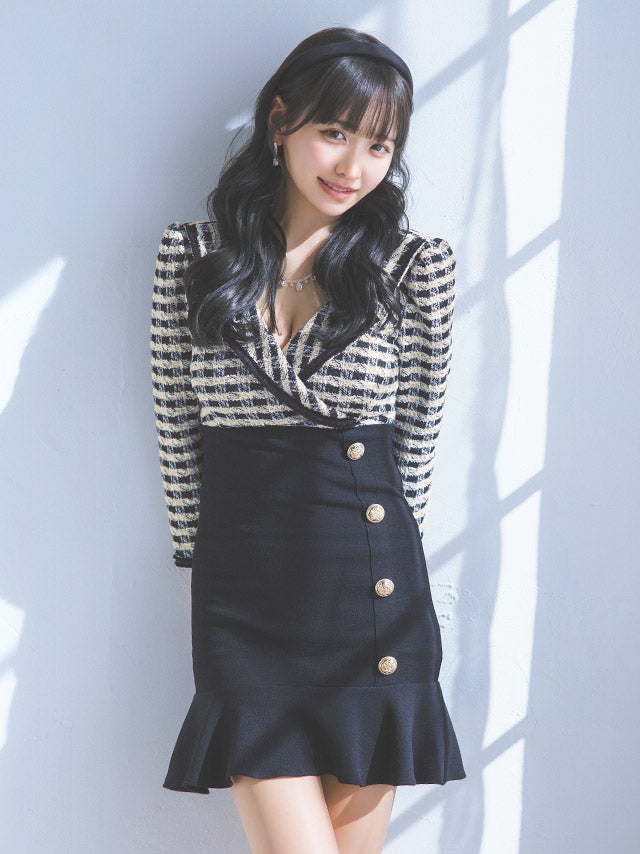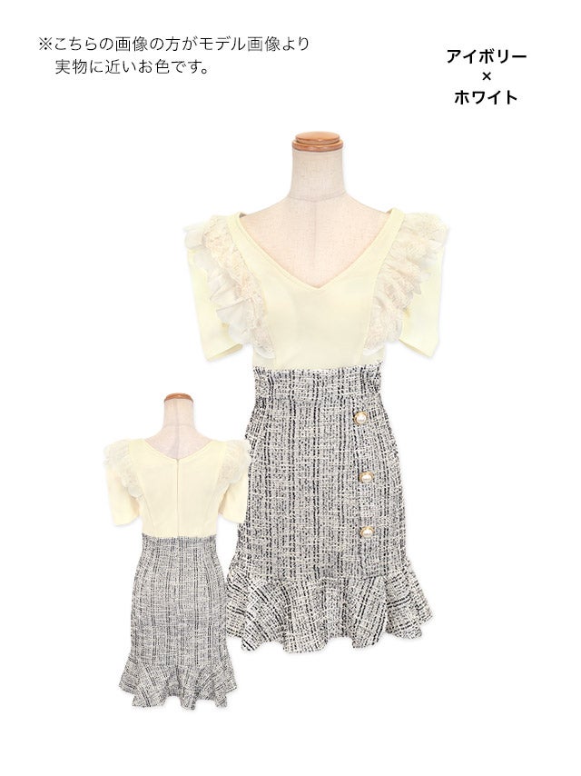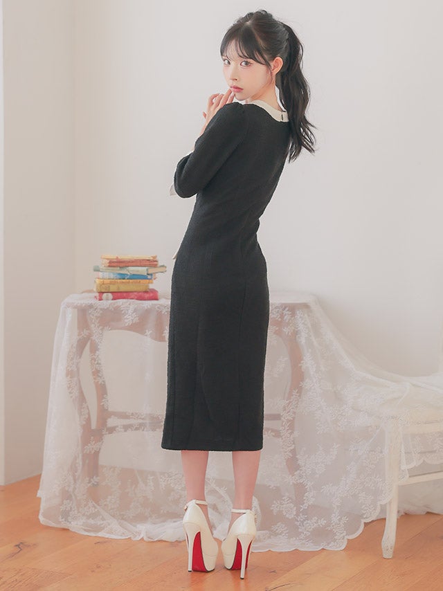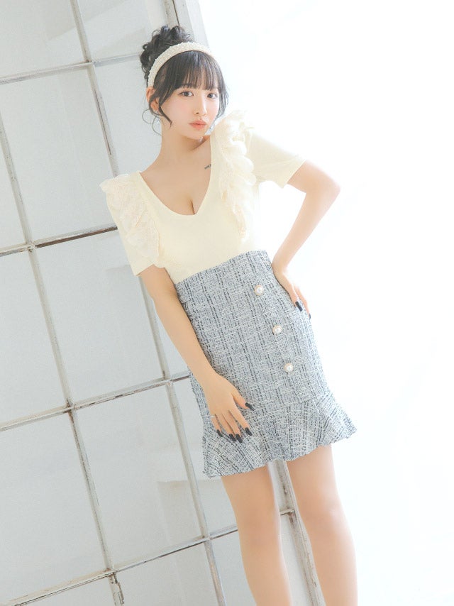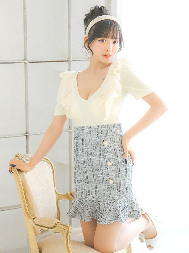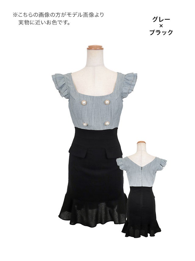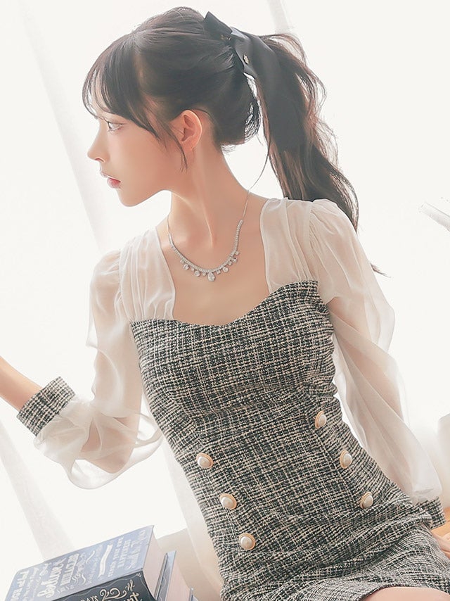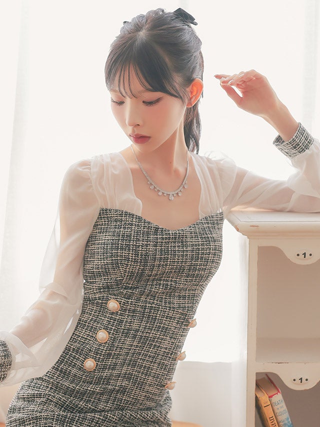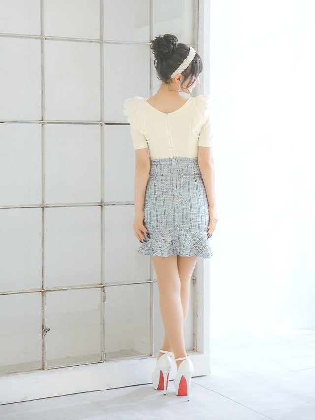 [韓国ドレス] 袖ありフリルレース切り替えツイードパールボタンタイトミニドレス