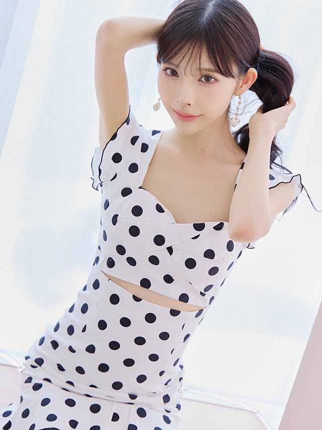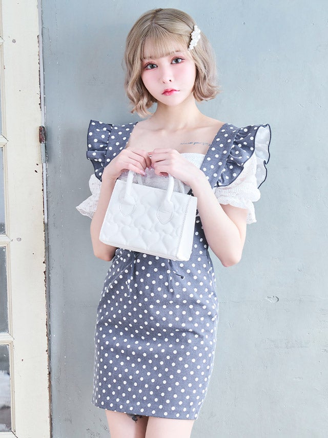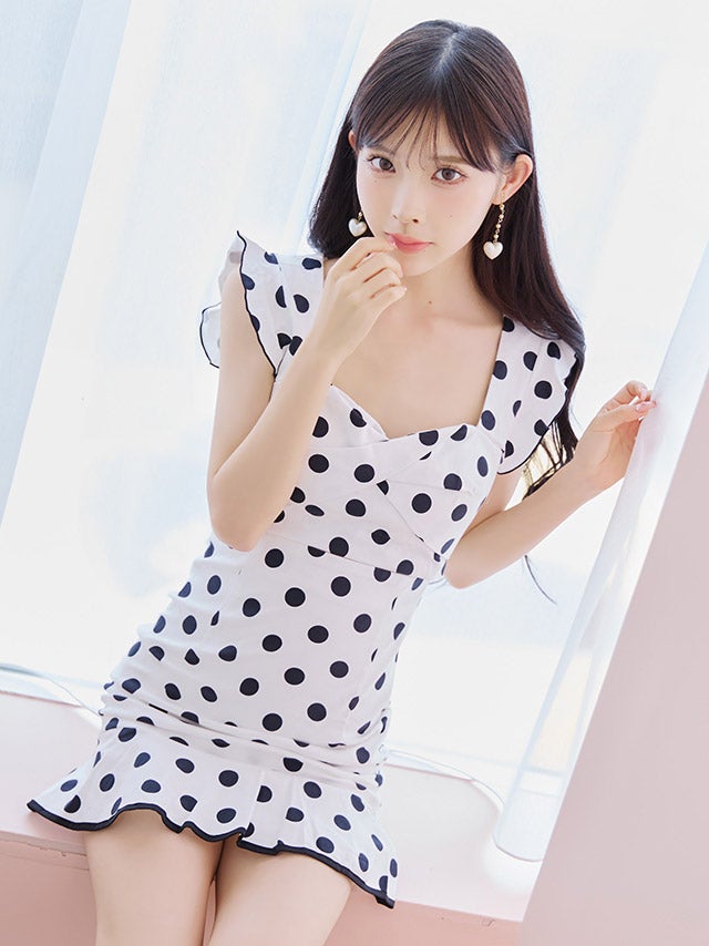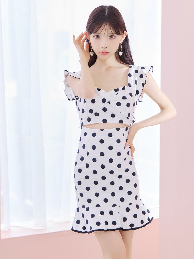 [韓国ドレス] フリル袖ドット柄ウエストカットタイトミニドレス