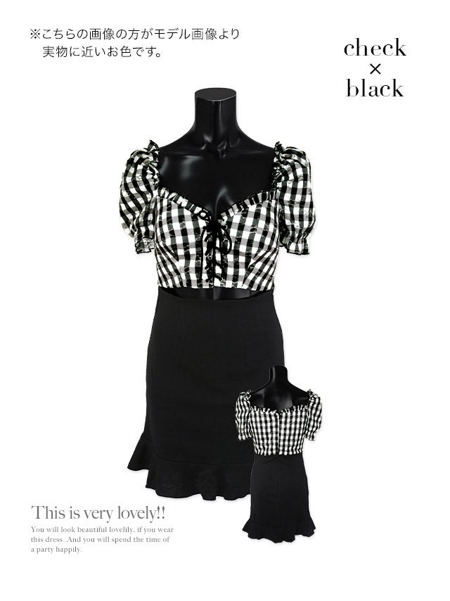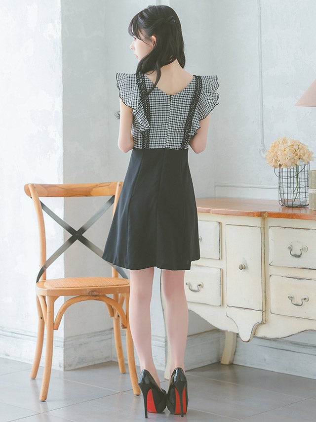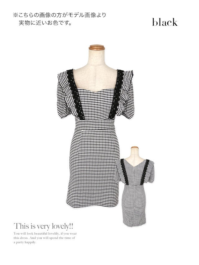 [韓国ドレス] ギンガムチェック柄 レーステープ フリル袖 ストレッチ 半袖 タイトミニドレス