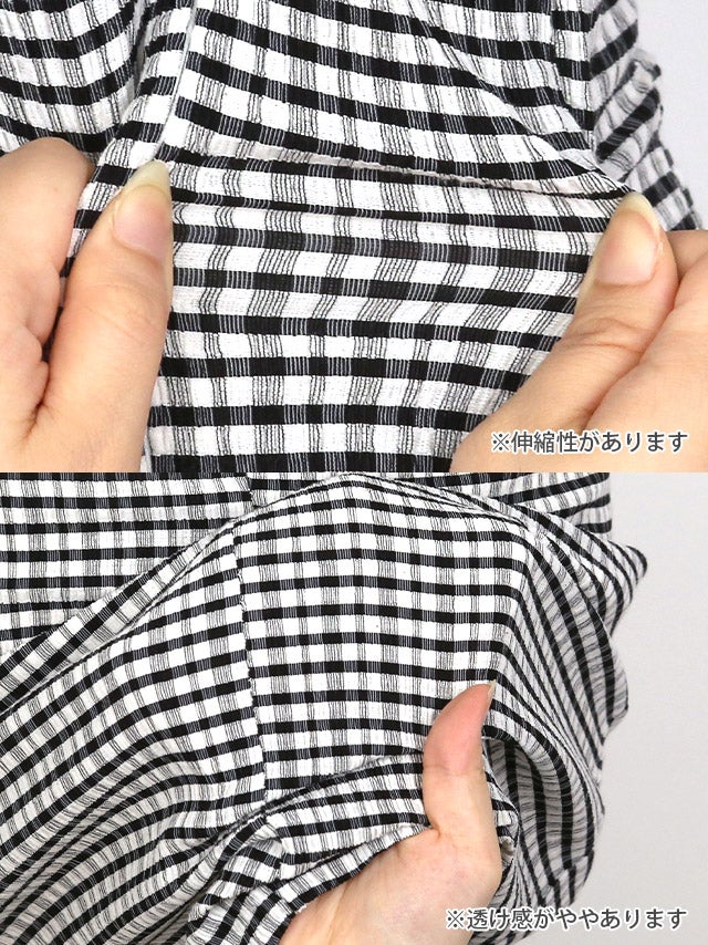 [韓国ドレス] ギンガムチェック柄ウエストカットギャザーパフスリーブミニ半袖ドレス