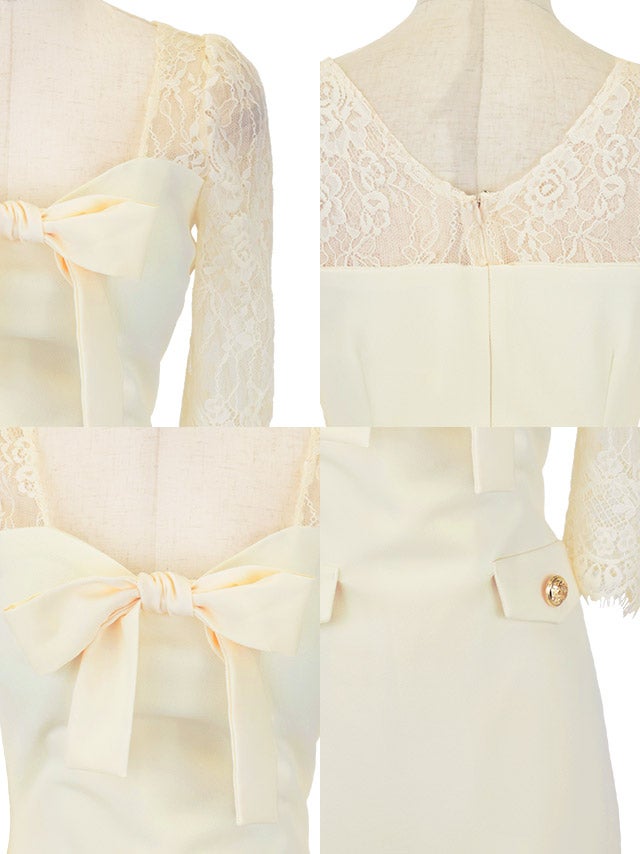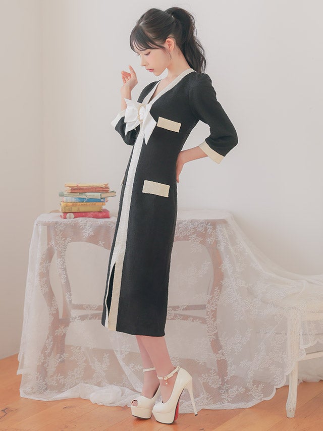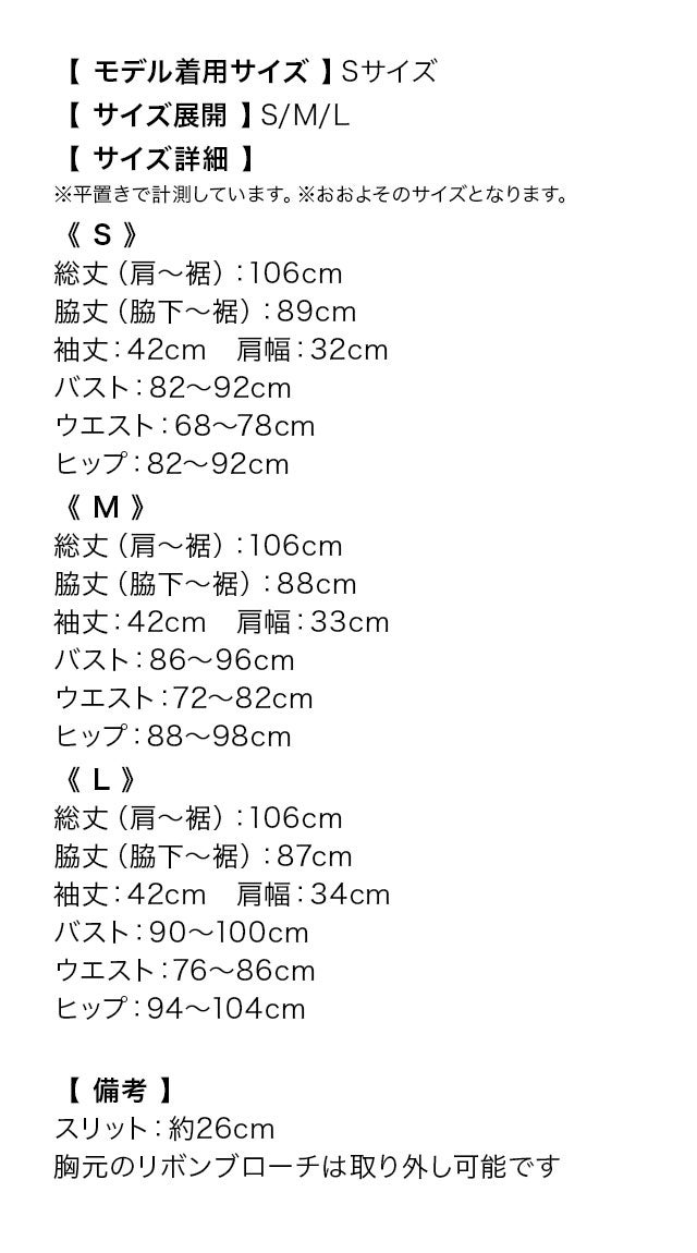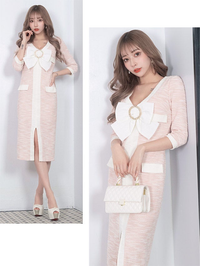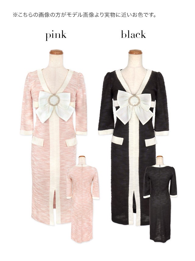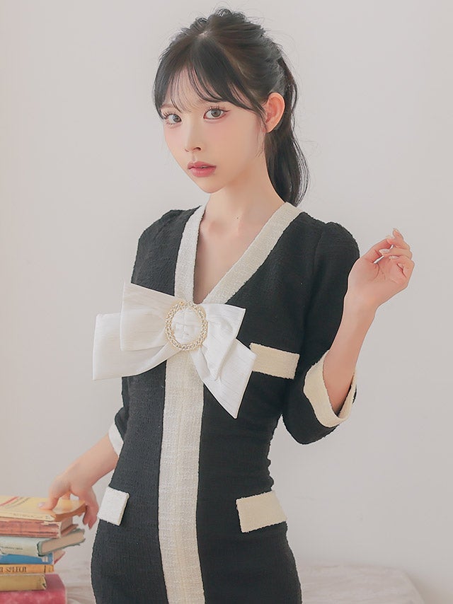 [韓国ドレス] ガーリーリボンブローチ付きVネック五部袖ありパイピングデザインフロントスリット膝丈ドレス