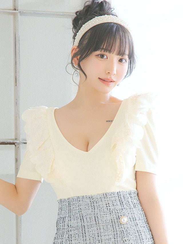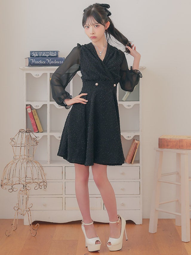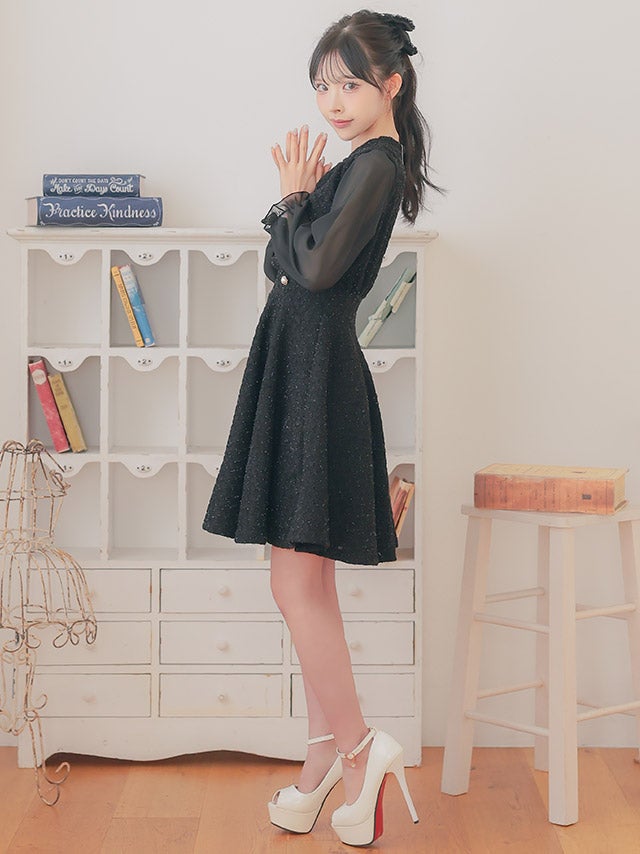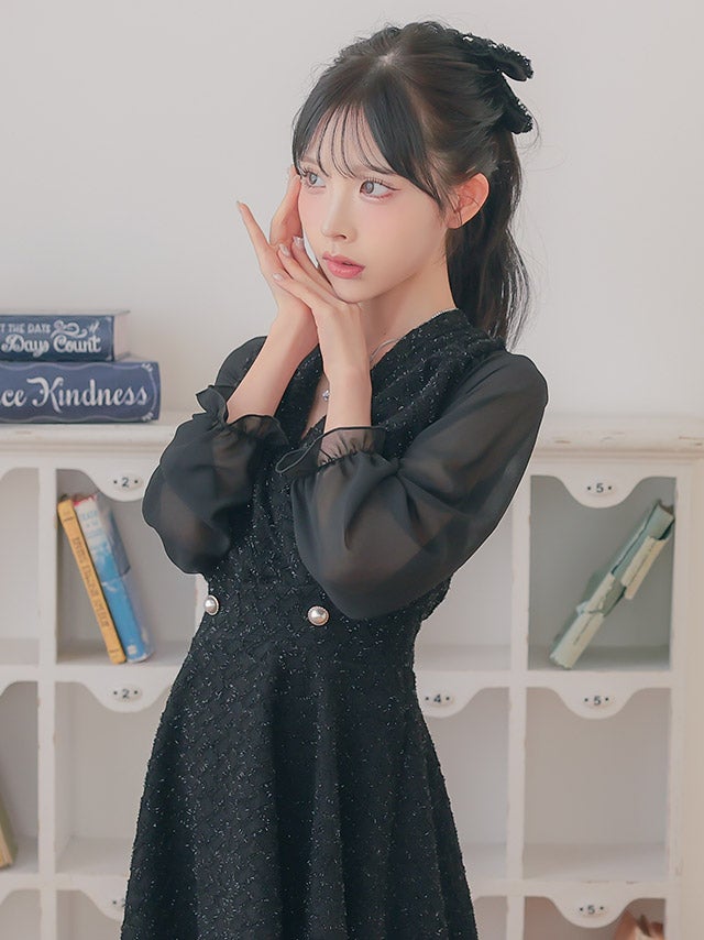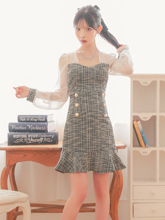 [韓国ドレス] シアー長袖ツイード裾フリルタイトミニドレス