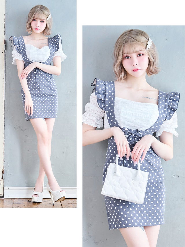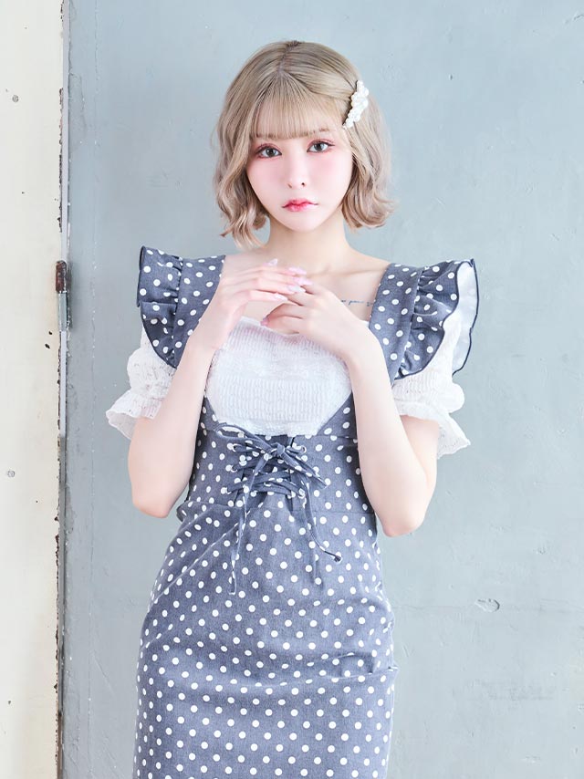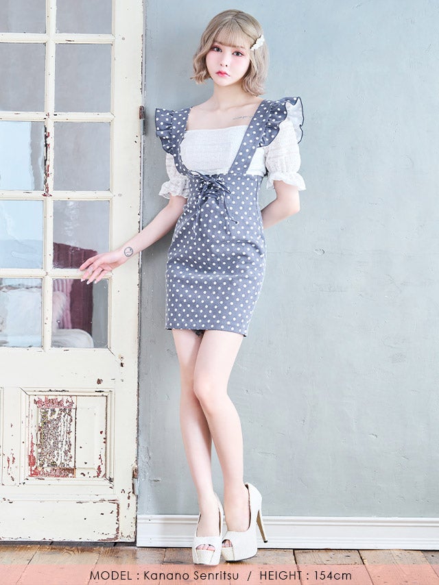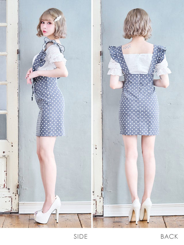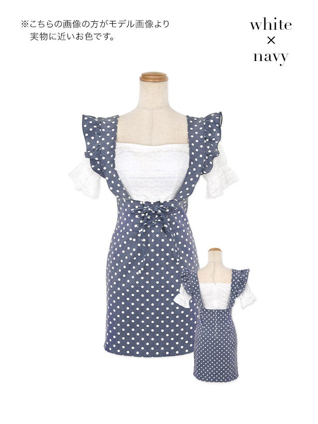 [韓国ドレス] オフショルダーレース×ドット柄ショルダーフリルサロペットデザインタイトミニドレス