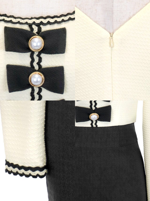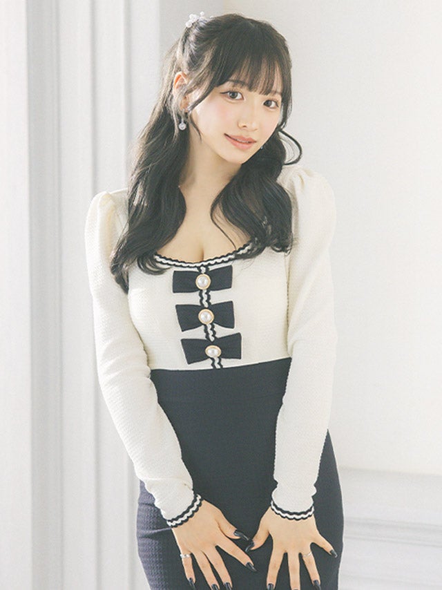[韓国ドレス] Uネックパールリボンデザイン長袖モノトーンストレッチタイトミニドレス
