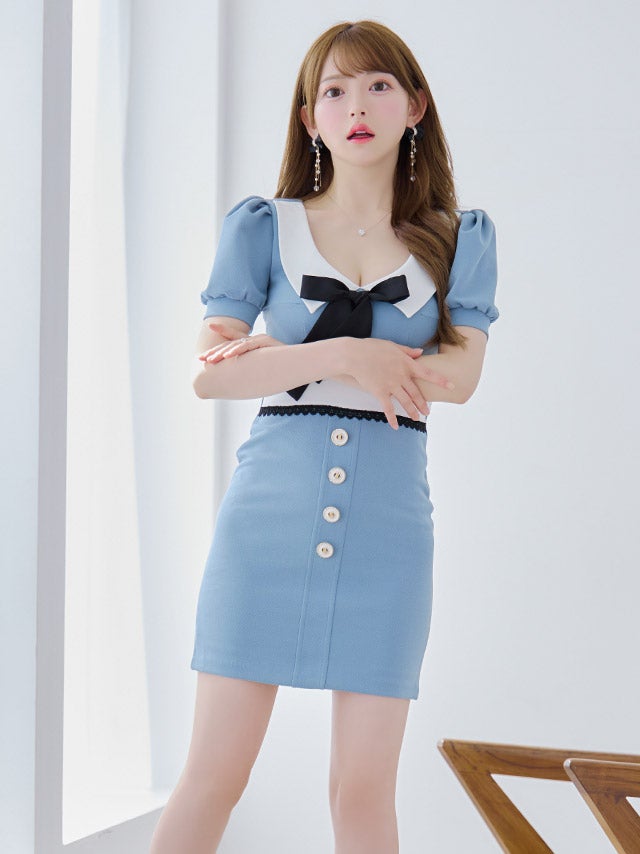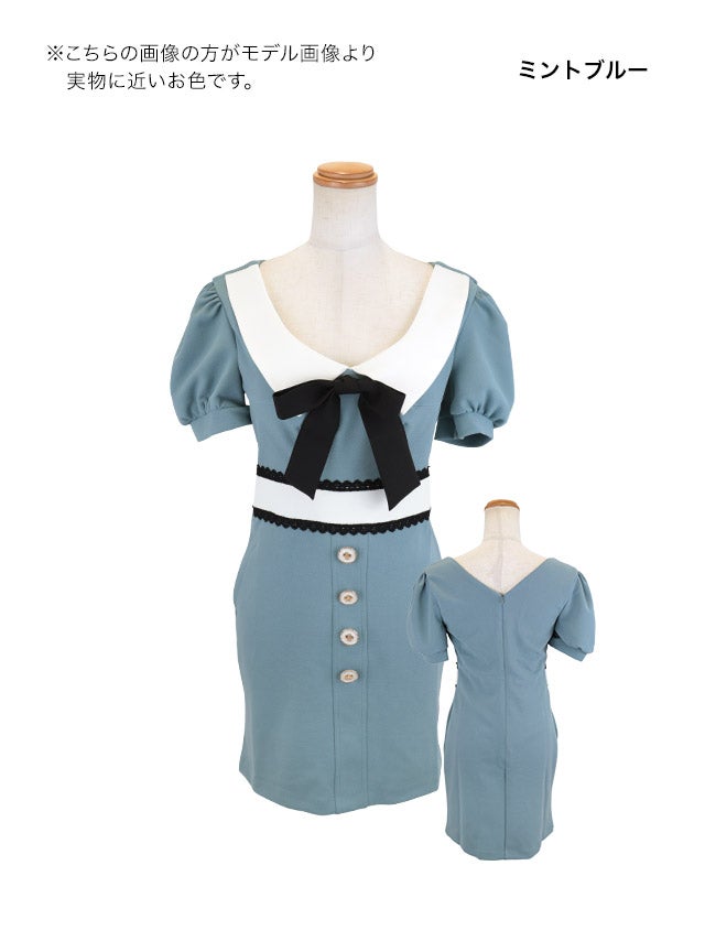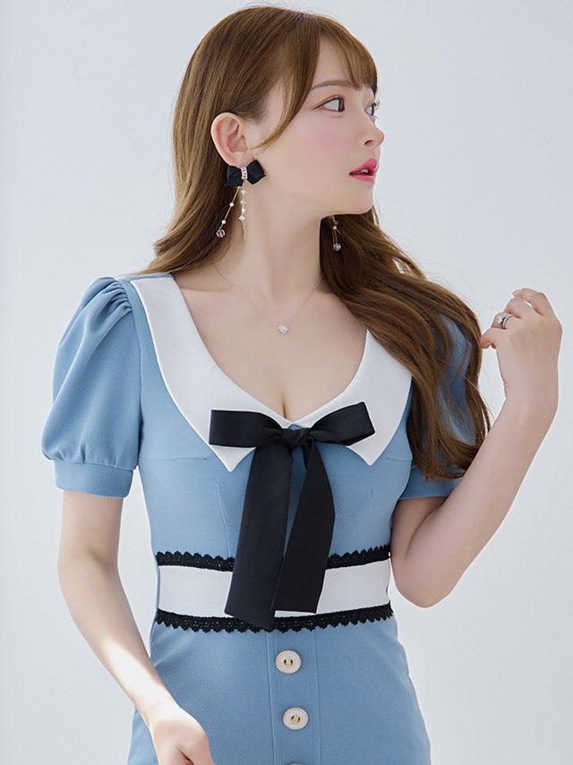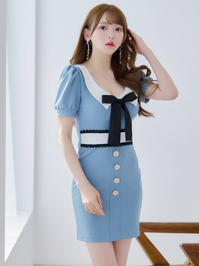 [韓国ドレス] 半袖パフスリーブ襟付きネックリボンウエストマークタイトミニドレス