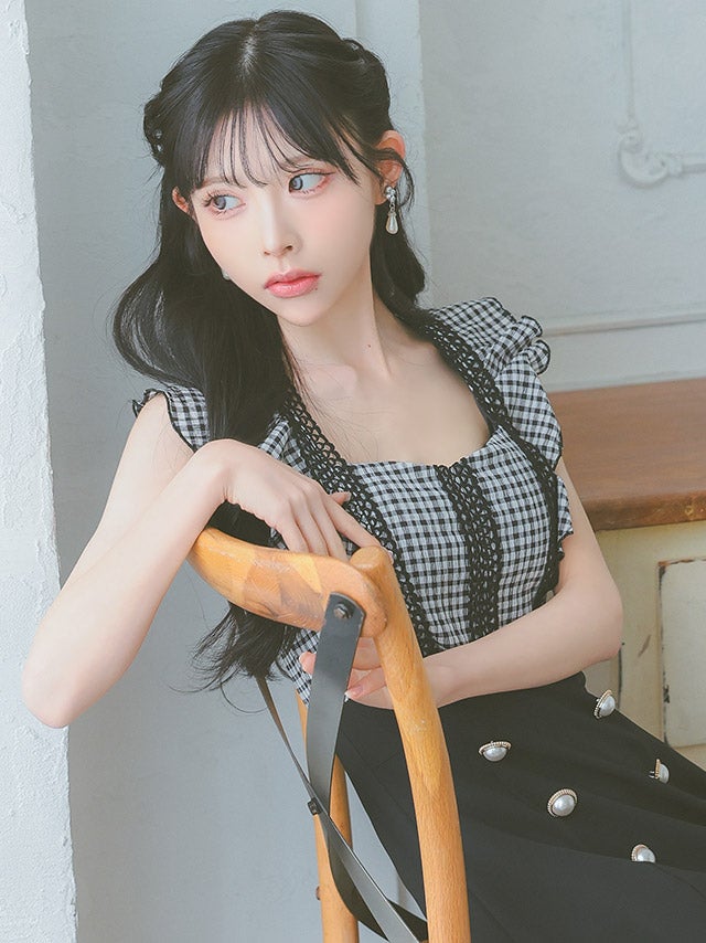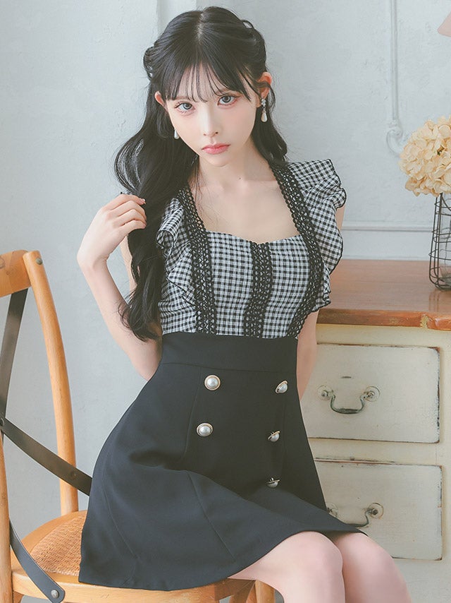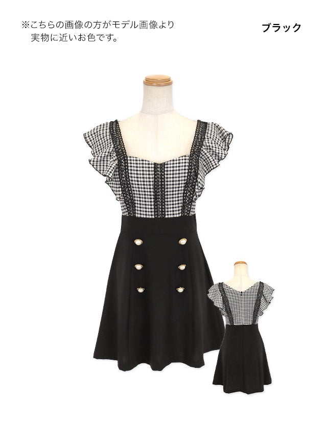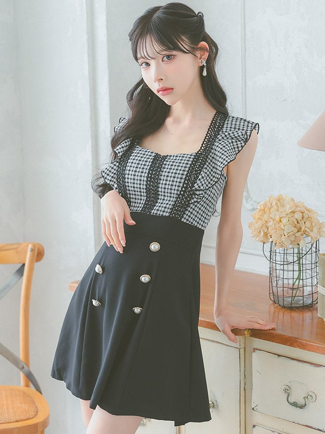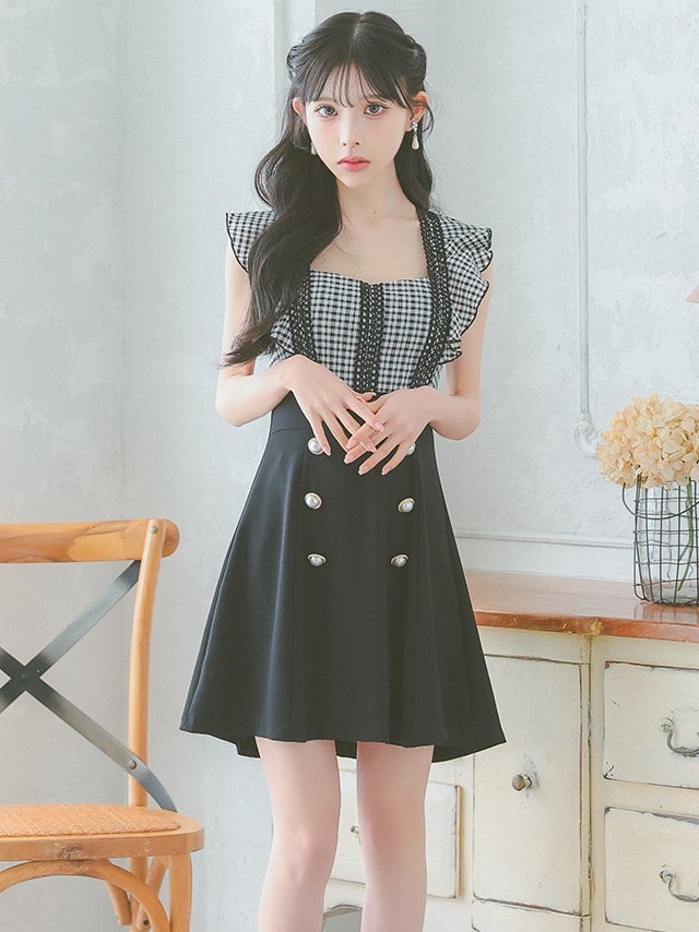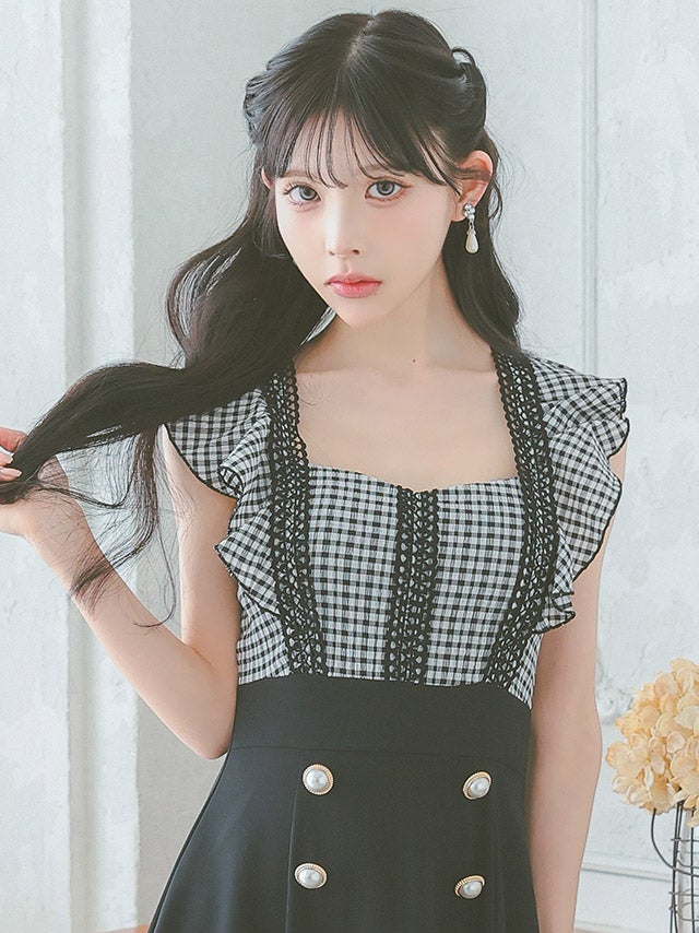 [韓国ドレス] ギンガムチェック柄フリル袖レースハイウエスト切替ダブルボタンフレアミニドレス