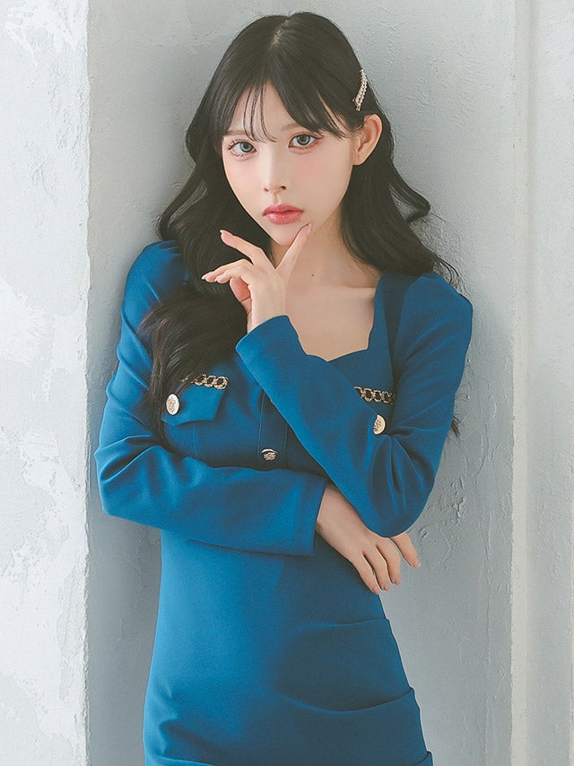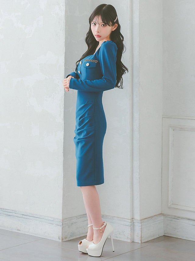 [韓国ドレス] ゴールドボタン付き長袖カシュクールタイトミニドレス