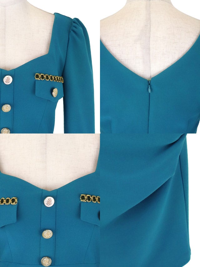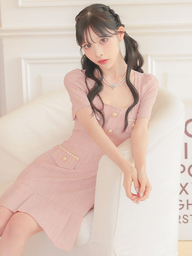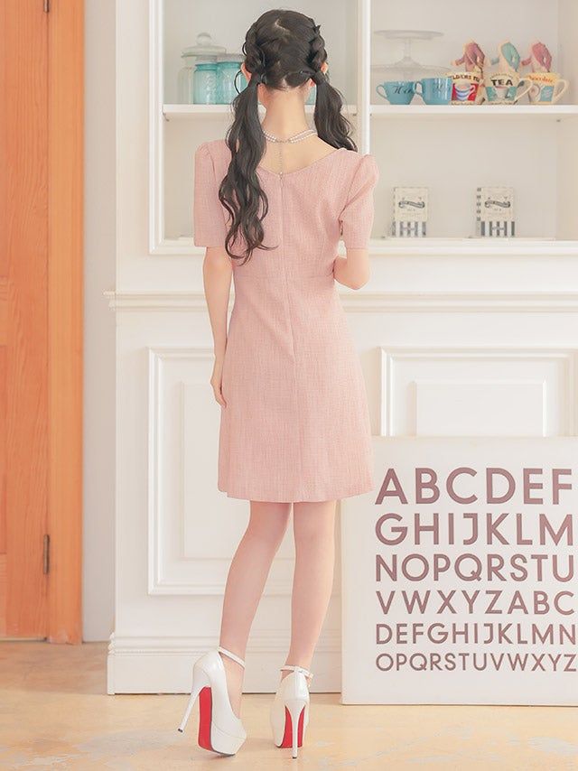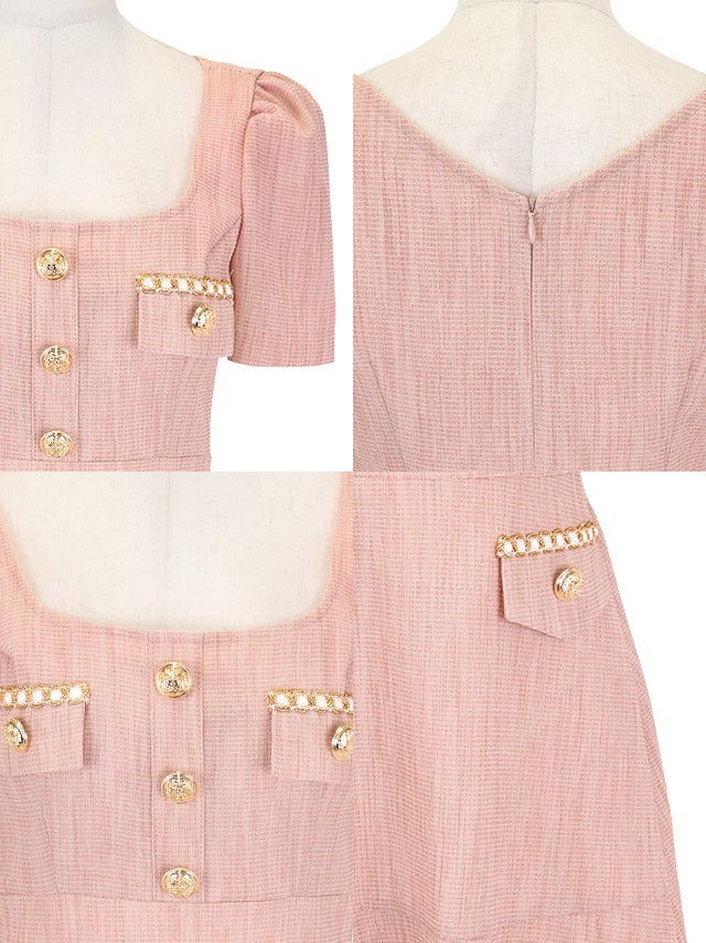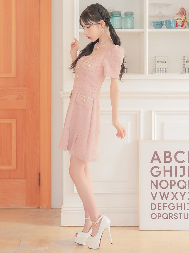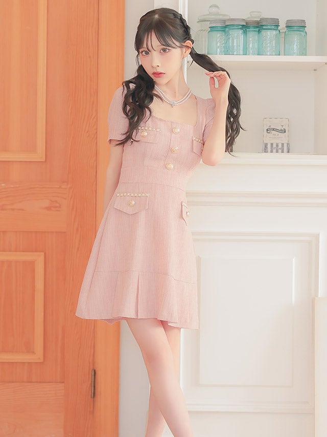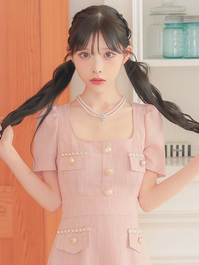 [韓国ドレス]スクエアネック半袖ゴールドボタンポケットフレアミニドレス