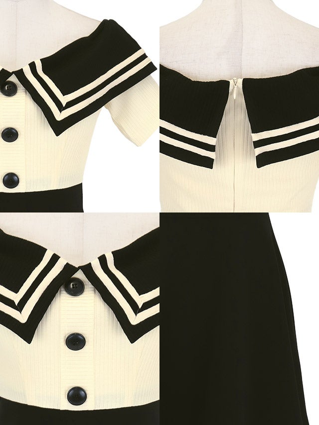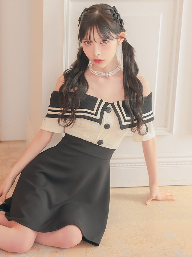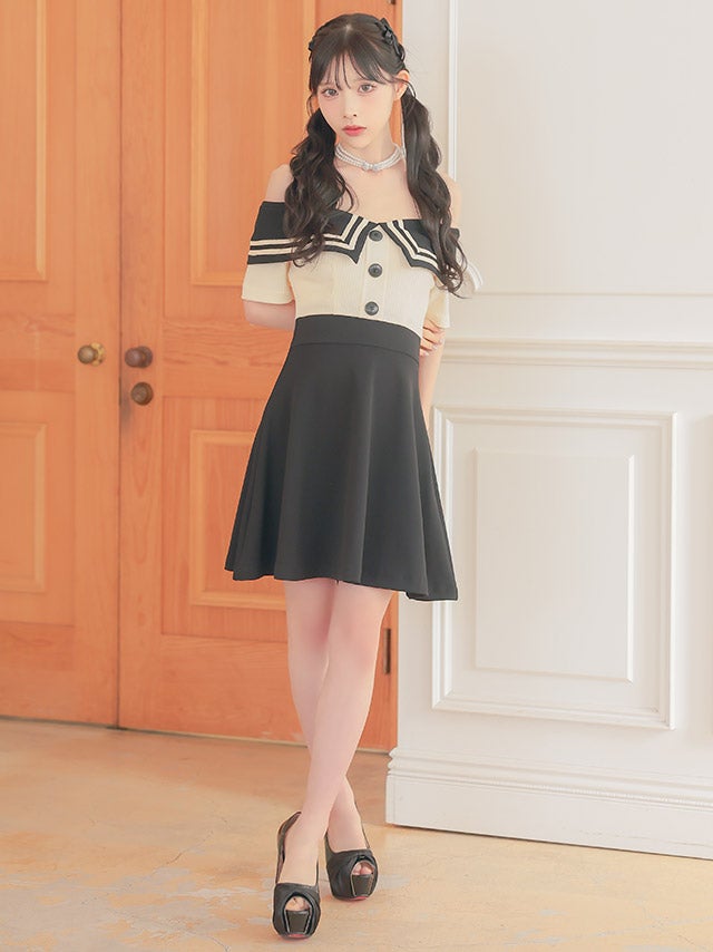 [韓国ドレス] 襟デザイン半袖ボタンウエスト切り替えフレアミニドレス