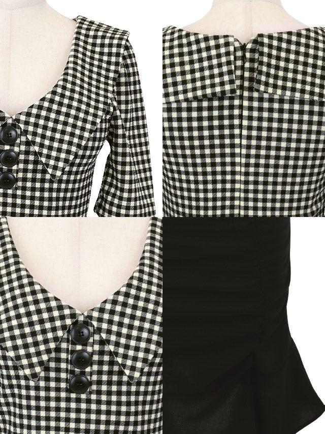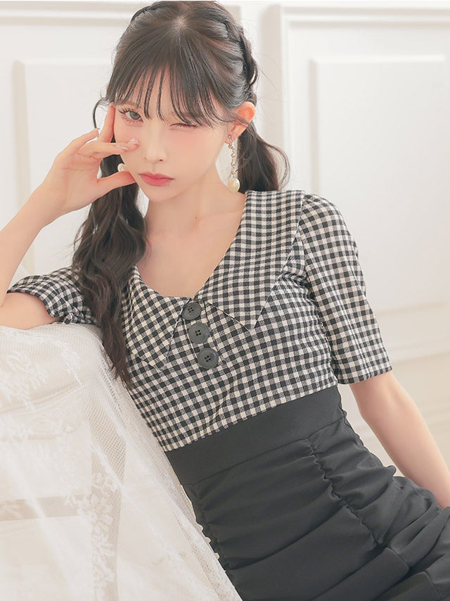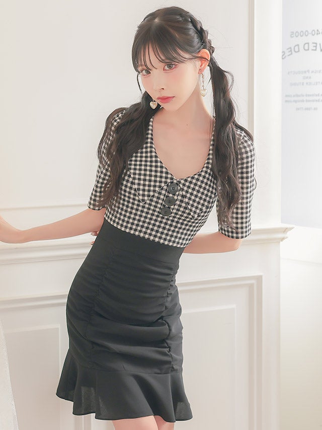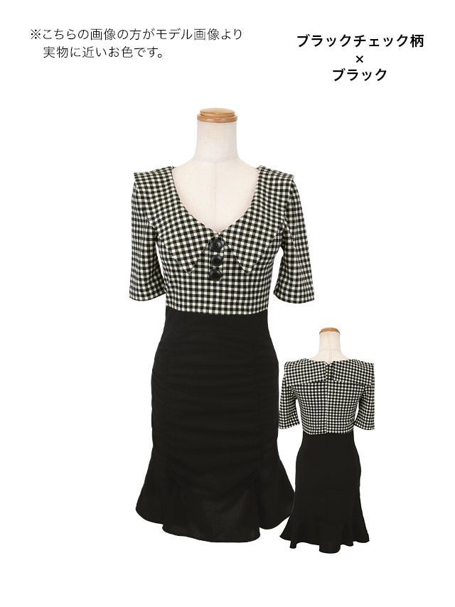 [韓国ドレス]襟デザインギンガムチェックウエスト切り替えマーメイドミニドレス