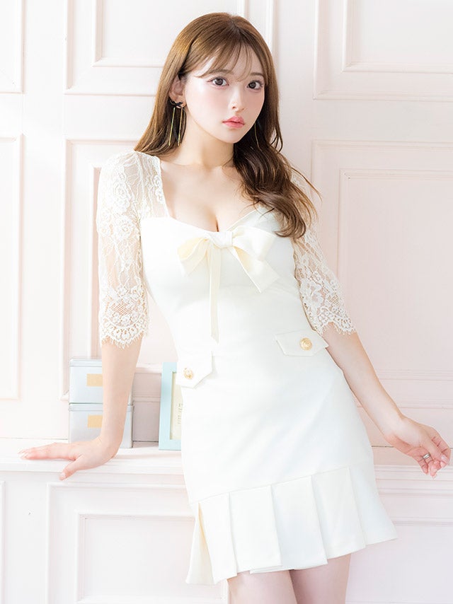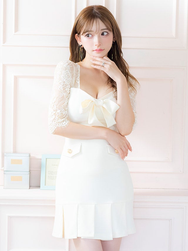 [韓国ドレス] ネックリボンフリルスカート五分袖レーススリーブマーメイドミニドレス