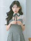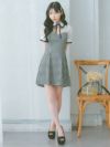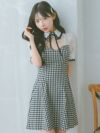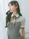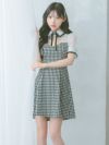 襟デザインバストカットネックリボンチェック柄半袖フレアミニドレス