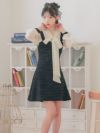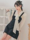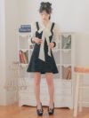 - ボウタイ長袖フリルシフォンドッキングネックリボンフレアミニドレス