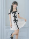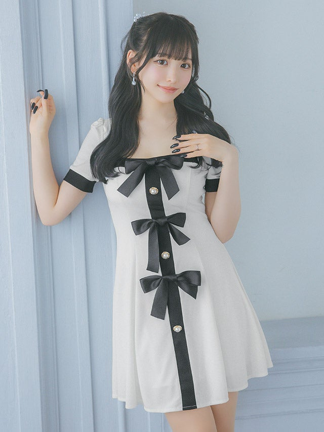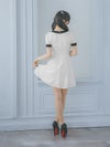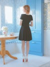 3. [韓国ドレス] 半袖スクエアネックパイピングサテンリボンモノトーンフレアミニドレス