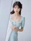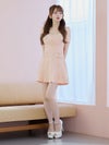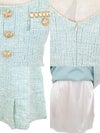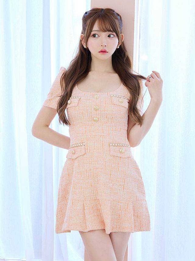 ツイード×金ボタンが上品で高級感たっぷり。デコルテが広めにあいたスクエアネックで、スッキリ小顔効果もバツグン。