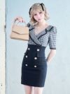- [韓国ドレス] 袖ありギンガムチェック柄レース襟デザインテーラードカラータイトミニドレス