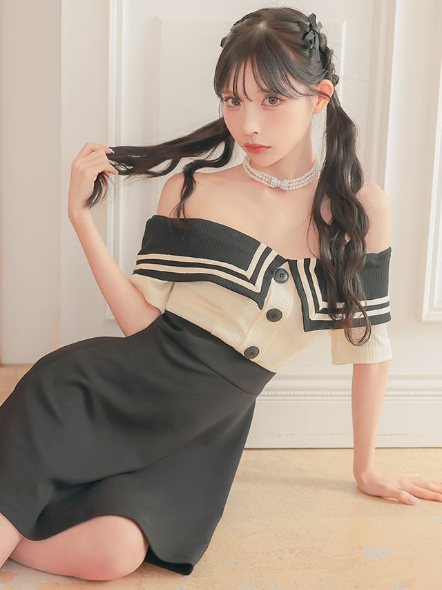 #緩苺 #ガーリーワンピ #襟デザイン #ブラック #モノトーン #マーメイド #七分袖 #ウエスト切替