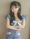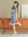 アイドル風デニム風素材がキュート。ネックリボンでさらにラブリーに。フリル袖とマーメイドシルエットで、かわいくスタイルアップ。