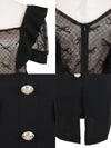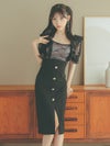 - [韓国ドレス] フリル付きシアーリボントップスウエスト切替フロントスリット膝丈タイトドレス