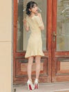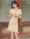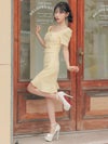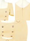 - [韓国ドレス]袖あり半袖スクエアネックゴールドボタンウエストベルトウエストカットマーメイドミニドレス